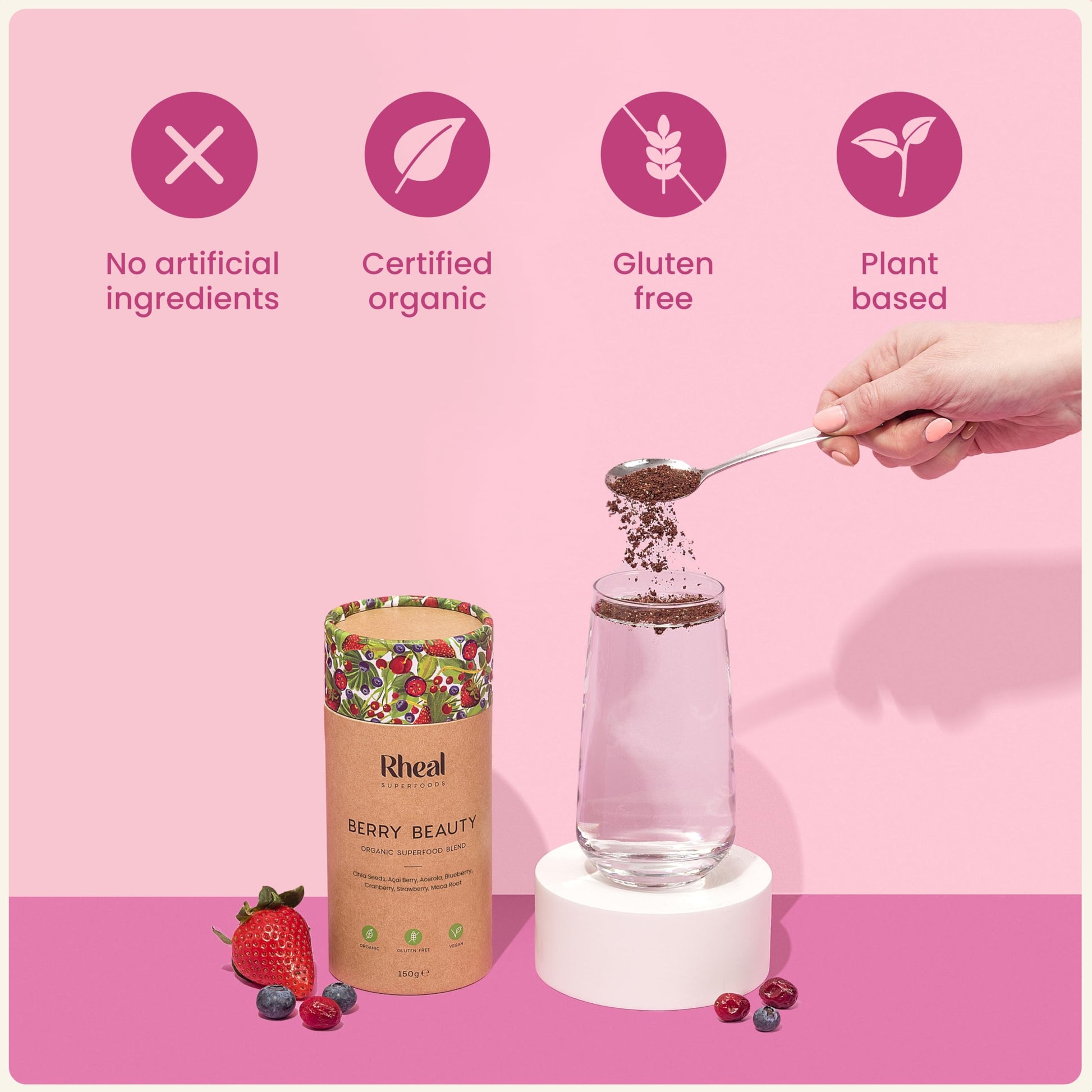 - GLOWING ANTIOXIDANTS: The Rheal Berry Beauty superfood blend contains Acerola cherry formulated to provide 100% of your daily serving of Vitamin C as well as a mix of beauty superfoods to help you glow on the inside & out.