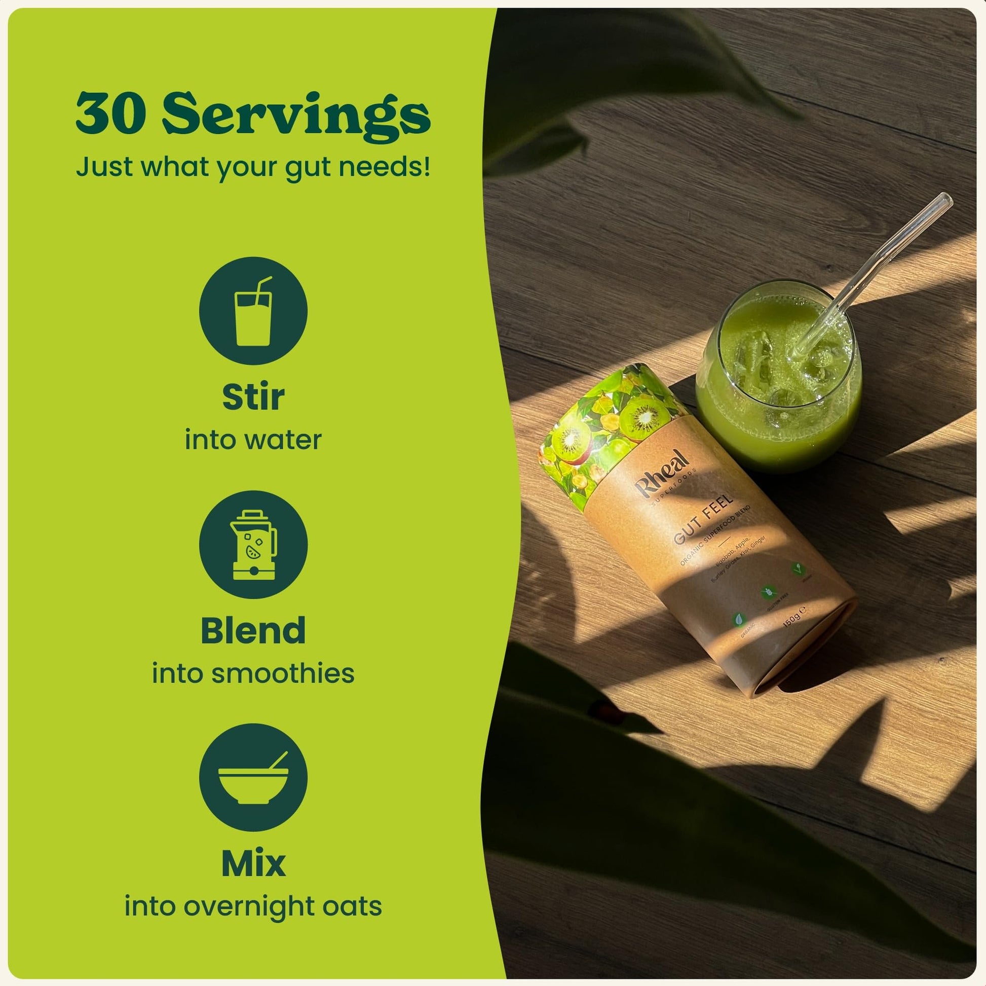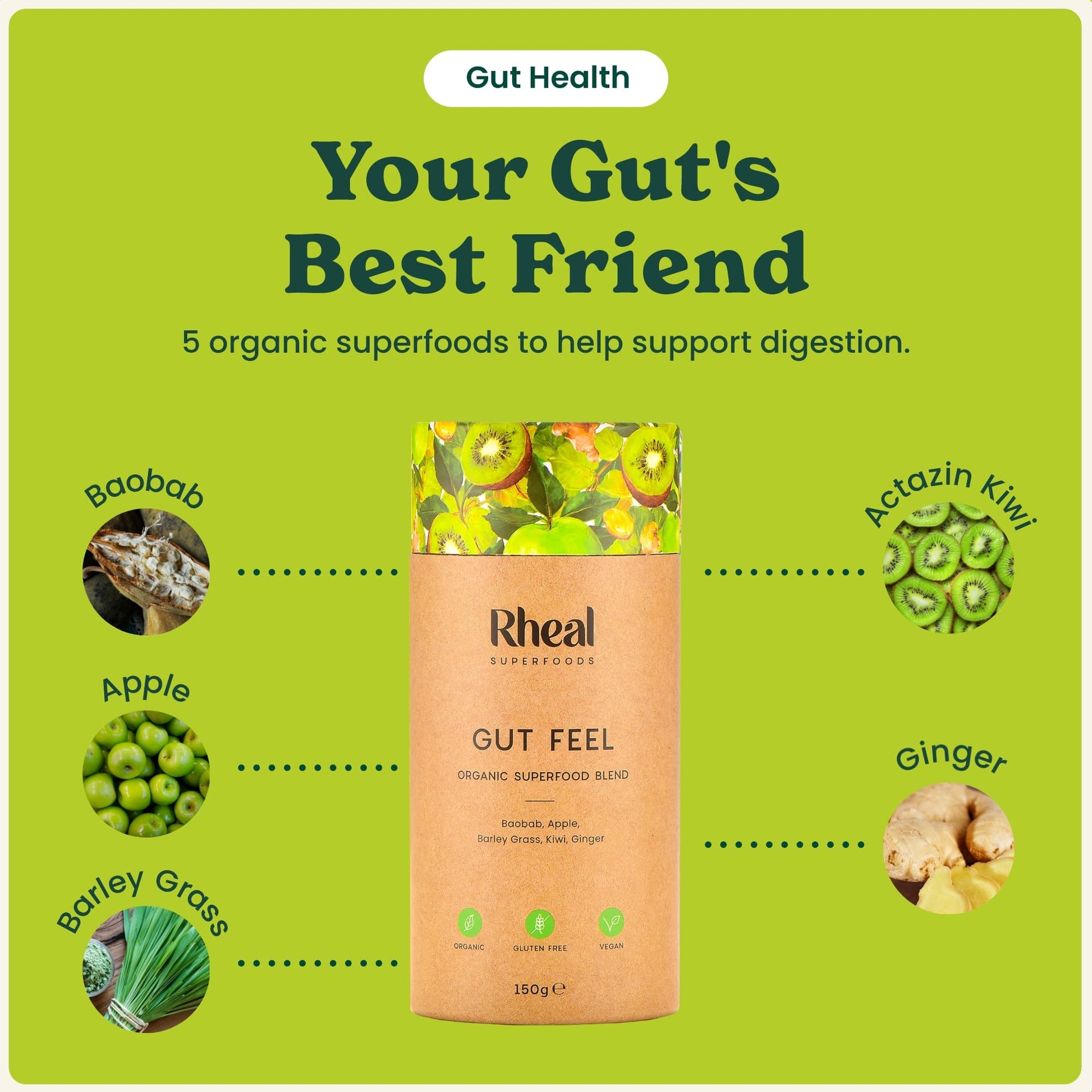 Rheal Gut Feel 150g | 30 Servings | Supports Digestion & Gut Health| Source of Fibre | 600mg Actazin Kiwi | Organic Superfoods with Ginger & Baobab | Certified B Corp