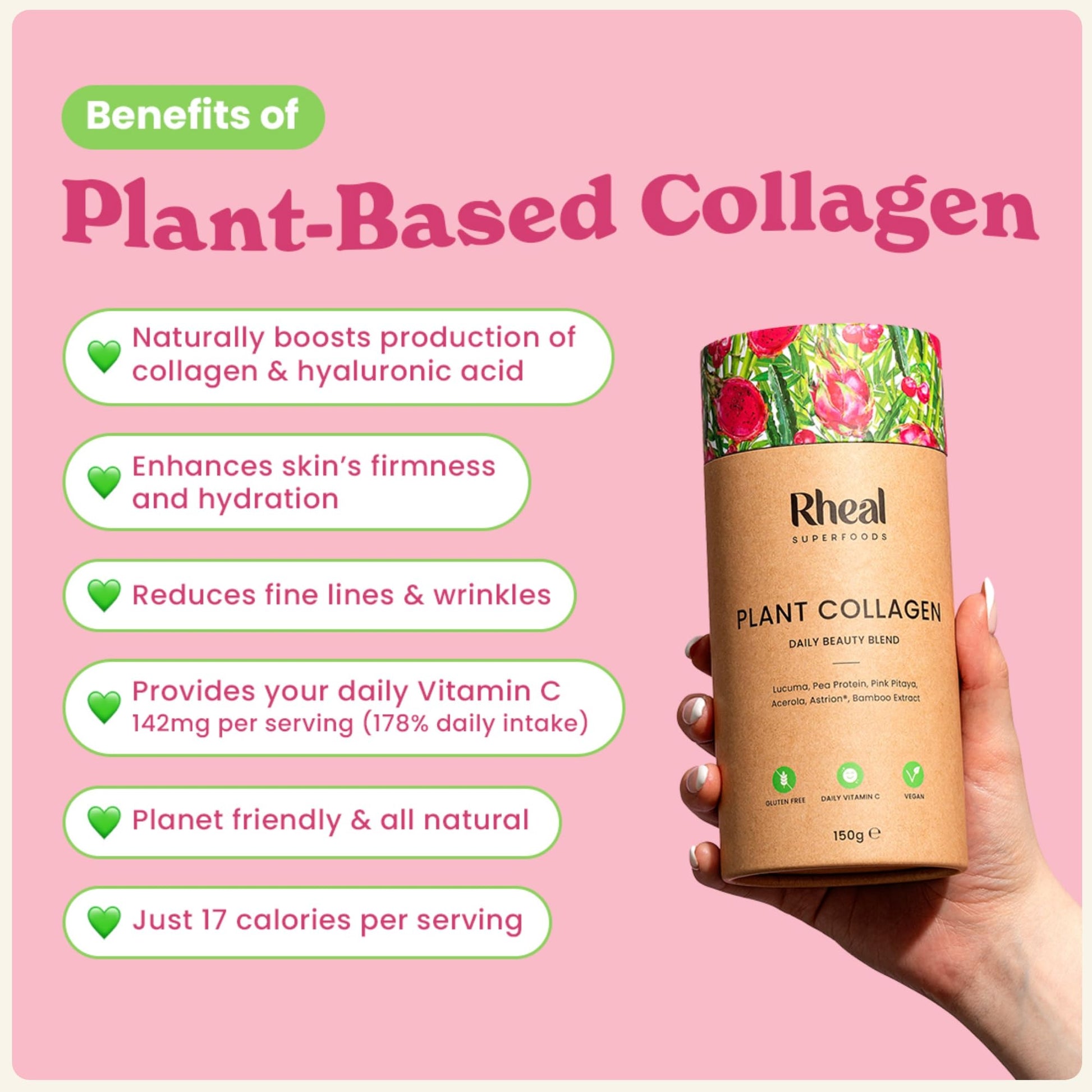 Plant Collagen - your daily beauty blend to increase collagen production for healthier, younger looking skin. Rheal Plant Collagen is a completely plant based collagen alternative, with clinically studied ingredients proven to increase our ability to produce more collagen and hyaluronic acid. Think of it as your daily dose of skin-loving nutrients, with natural superfood ingredients chosen to help you rediscover your natural glow from within. As well as being fantastic for skin health and hydration, it has other benefits too such as helping joint pain or stiffness and strengthening hair and nails.More Info