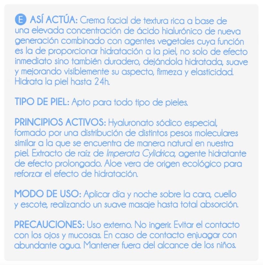 THIS IS HOW IT WORKS: The Rich Texture Facial Cream based on a high concentration of new generation Hyaluronic Acid combined with vegetable agents whose function is to provide hydration to the skin, not only of immediate effect but also durable, leaving it hydrated, soft and visibly improving its appearance, firmness and elasticity. Moisturizes the skin up to 24 hours. SKIN TYPE: Suitable for all skin types. ACTIVE PRINCIPLES: Special sodium hyaluronate, formed by a distribution of different molecular weights similar to that found naturally in our skin. Imperata Cylidrica root extract, moisturizing agent with prolonged effect. Aloe vera of organic origin to reinforce the effect of hydration. How to use: Apply day and night on the face, neck and décolleté, performing a gentle massage until completely absorbed. DERMATOLOGICALLY TESTED PRECAUTIONS: External use. Do not ingest. Avoid contact with eyes and mucous membranes. In case of contact rinse thoroughly with water. Keep out of reach of children.More Info