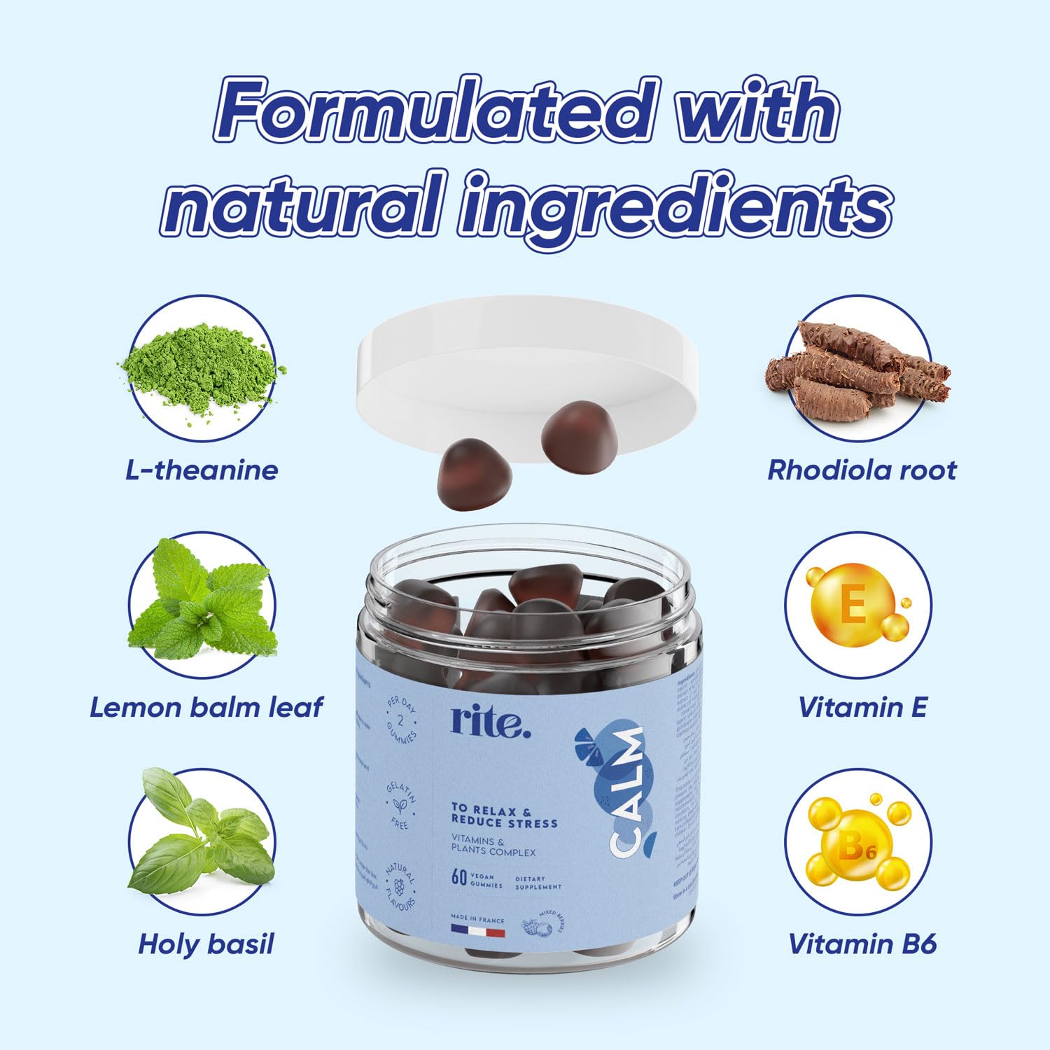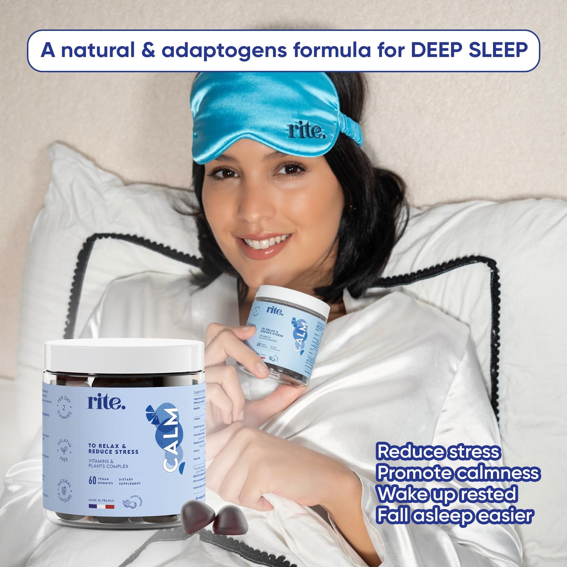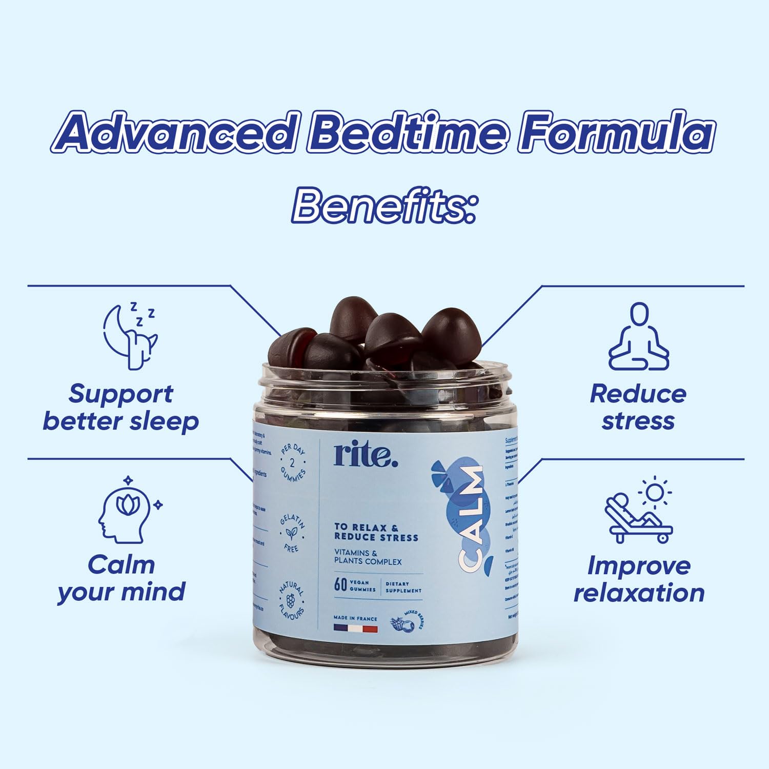 Rite Calm Gummies, Sleep Aid, Melatonin Alternative, Relaxation, Vegan, Natural Adaptogenic Botanicals, L-Theanine, Lemon Balm, Berries Flavour (60 Count,1 Month)