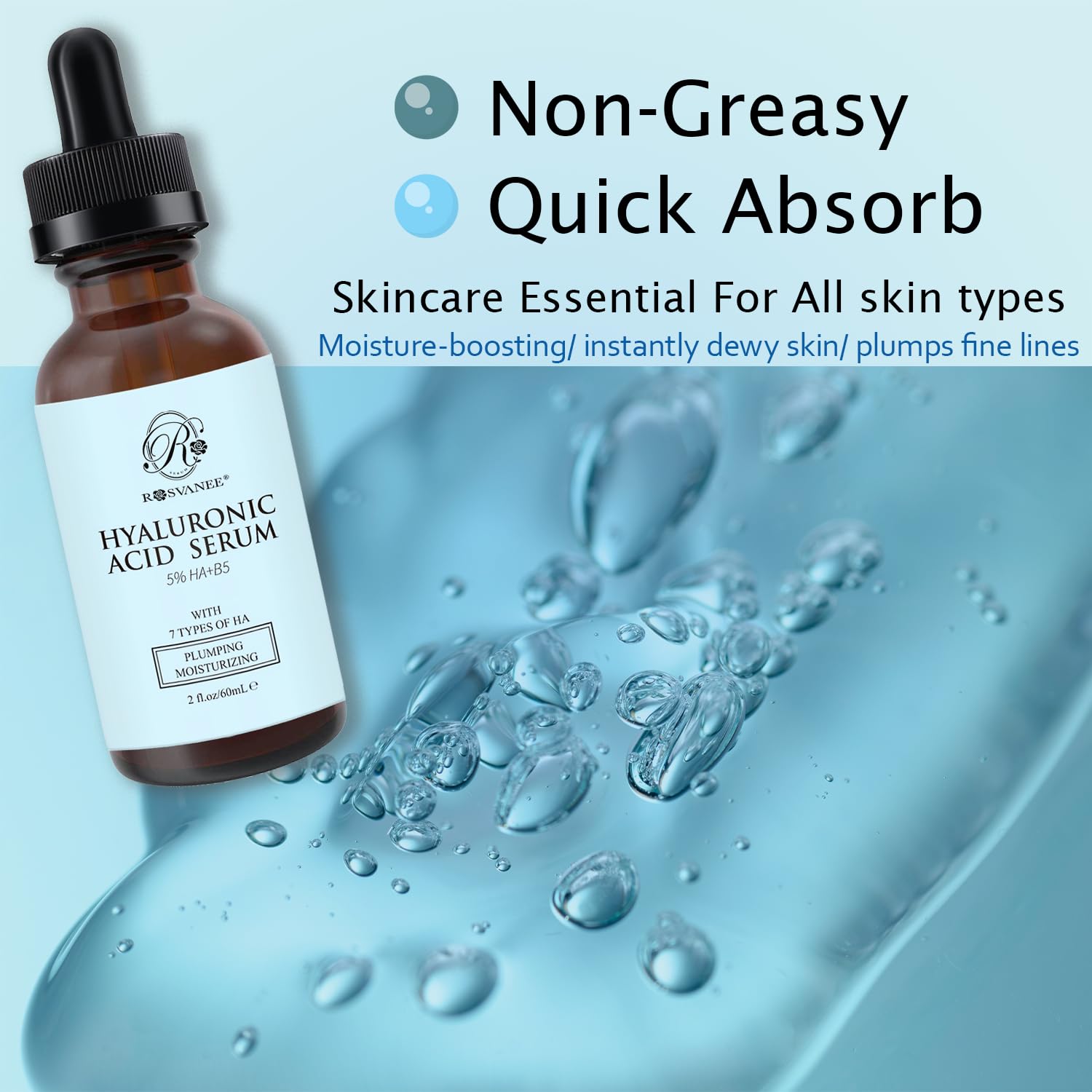 ROSVANEE Hyaluronic Acid Serum for Face 60ml, 5% Hyaluronic Acid + Vitamin B5 with Niacinamide, Anti Aging Serum Intense Hydration Moisture, Vegan and Paraben-Free
