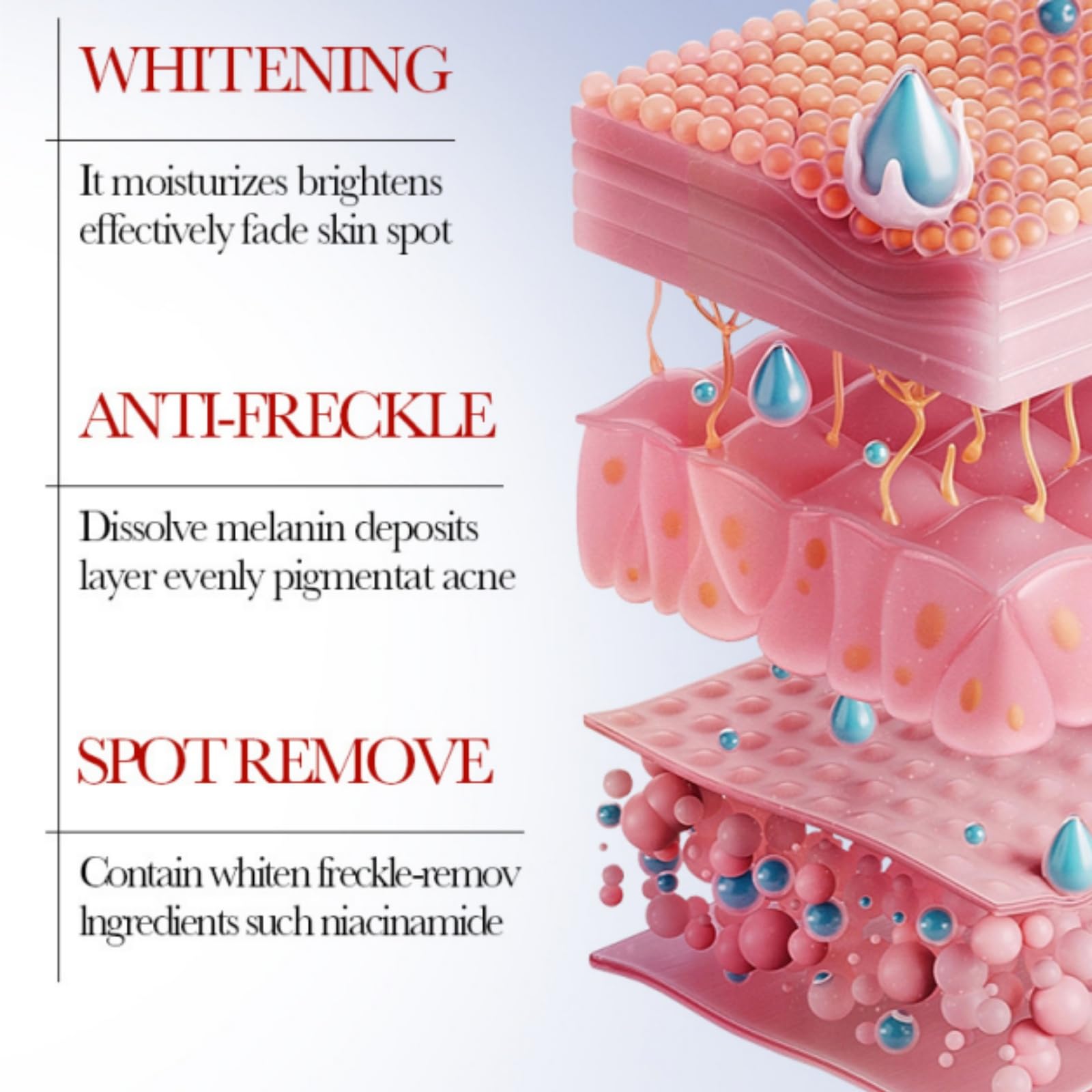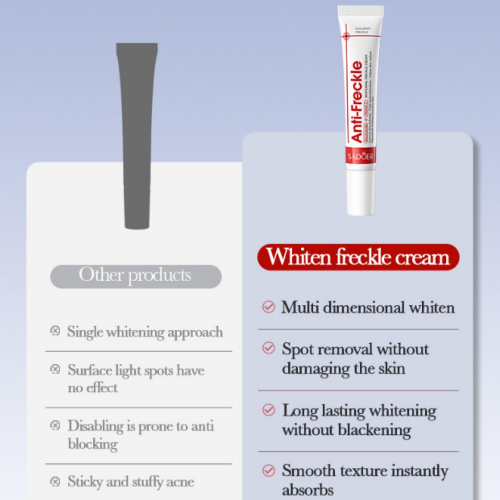 Benefits:1.This skin lightening cream can help us fade spots,the whitening cream improves dullness and make our skin smooth and bright.