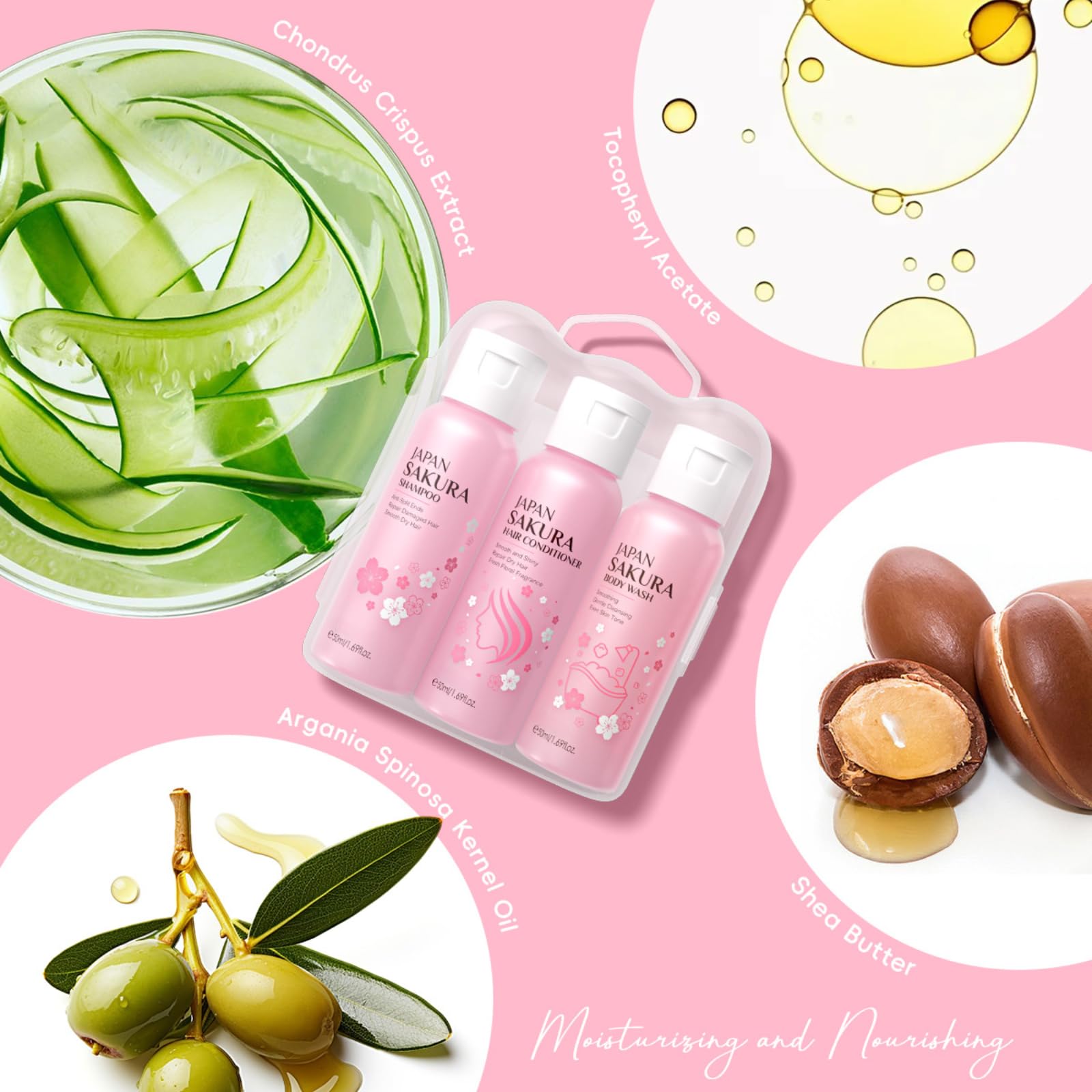 Travel-Friendly Hair and Skin Care Set Ideal for frequent travelers or those looking for a compact yet effective hair and body care solution, this Sakura Shower Gift Set for Women provides the essential care for hair and skin, offering nourishment and moisture with every use.Benefits: