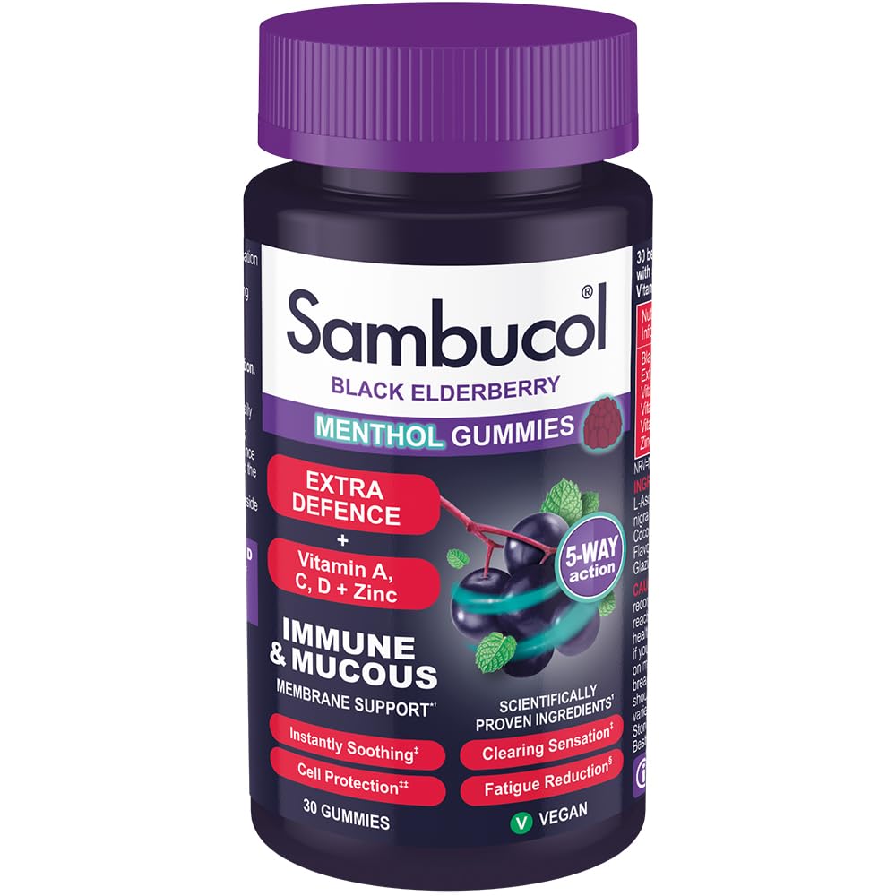 Sambucol Extra Defence Menthol Gummies | Vitamin A | Vitamin C | Vitamin D | Zinc | Immune Support | 30 Gummies