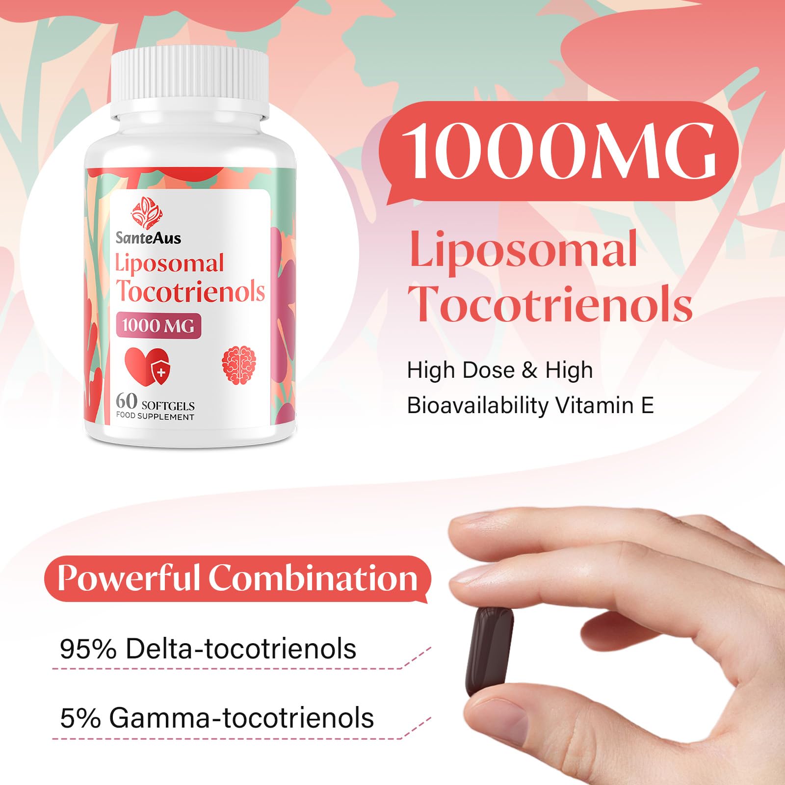 SanteAus Liposomal Tocotrienols Supplement 1000mg, Vitamin E, High Bioavailability, 95% Delta & 5% Gamma Tocotrienol Capsules, for Immune, Bone, Skin, and Antioxidant Support, No Fillers, No Soy