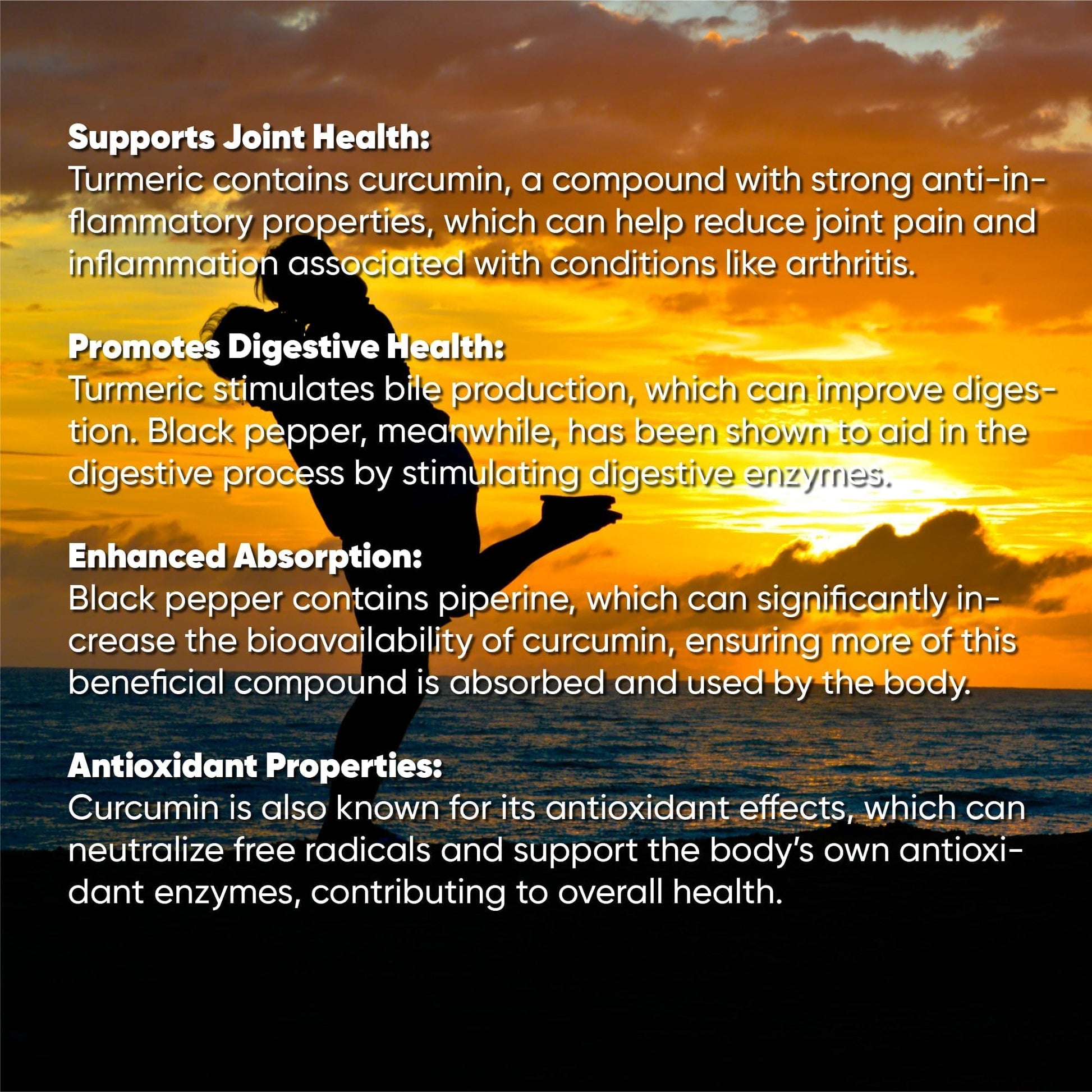- Organic Piperine found in black pepper to help your body absorb Curcumin which in turn enhances the benefits of the turmeric.