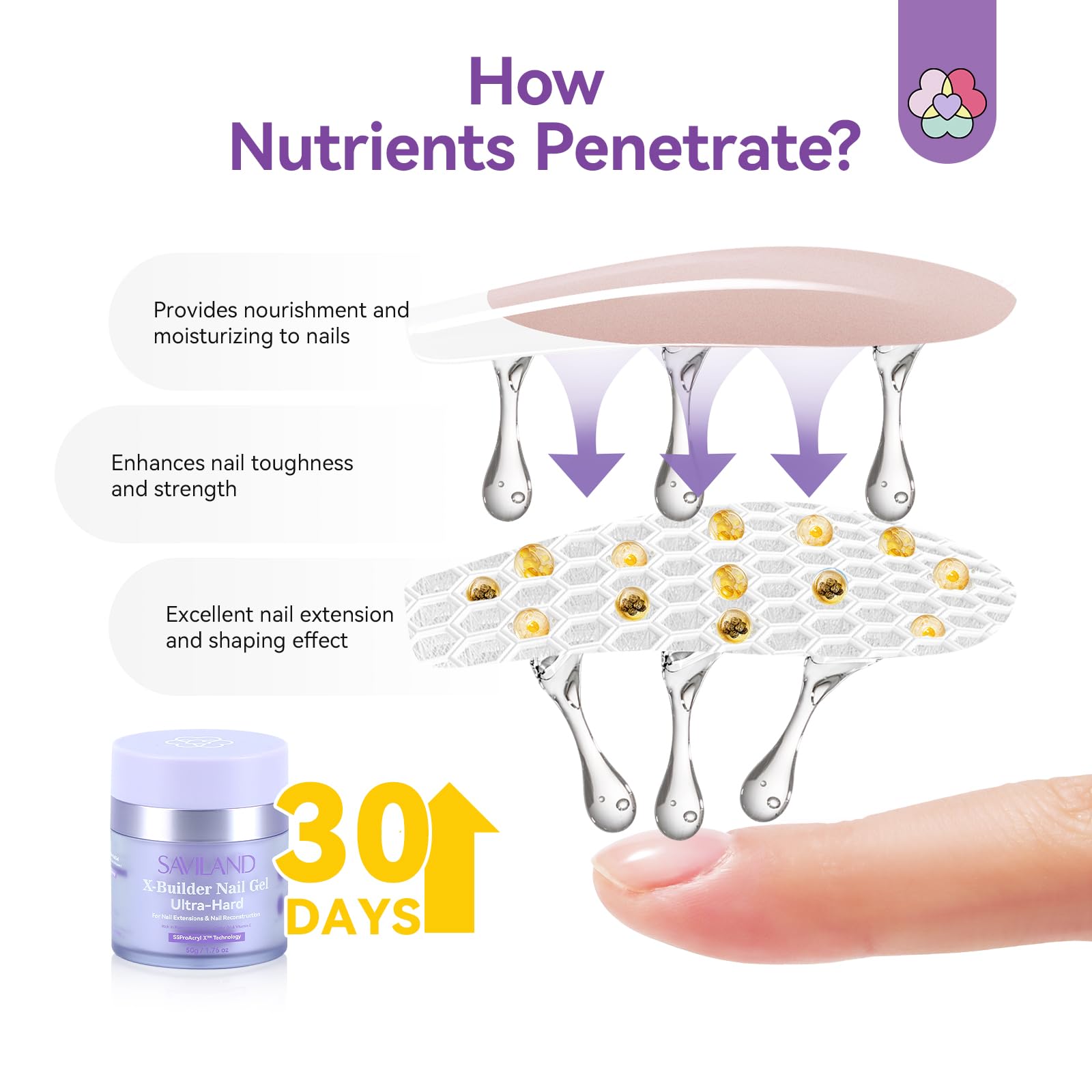 "1. SAVILAND Builder Nail Gel offers robust, pliable, and lightweight enhancements and repairs for improved nail appearance. 2. With nano particles driven by SSProAcryl X Technology, boasting exceptional resilience and strength, effectively reinforcing nails and enhancing their overall longevity. 3. Infused with Castor Oil, Vitamin E, and Keratin, it is virtually low smell and bubble-free, designed to moisturize and safeguard your nails while enhancing their toughness and rigidity. 4. Enjoy flawless nail art for up to 30 days with superior adhesion that prevents falling and cracking. 5. Features a self-leveling formula that enhances the C curve effortlessly and adheres naturally to nails for easy shaping. The air cushion design enables precise control over the gel application, ensuring just the right amount is used. 6. With multiple functions, perfect for extension, shaping, apex building, it can explore the creative variuous usage, such as shell ripple, opal stone effect, water ripple."More Info