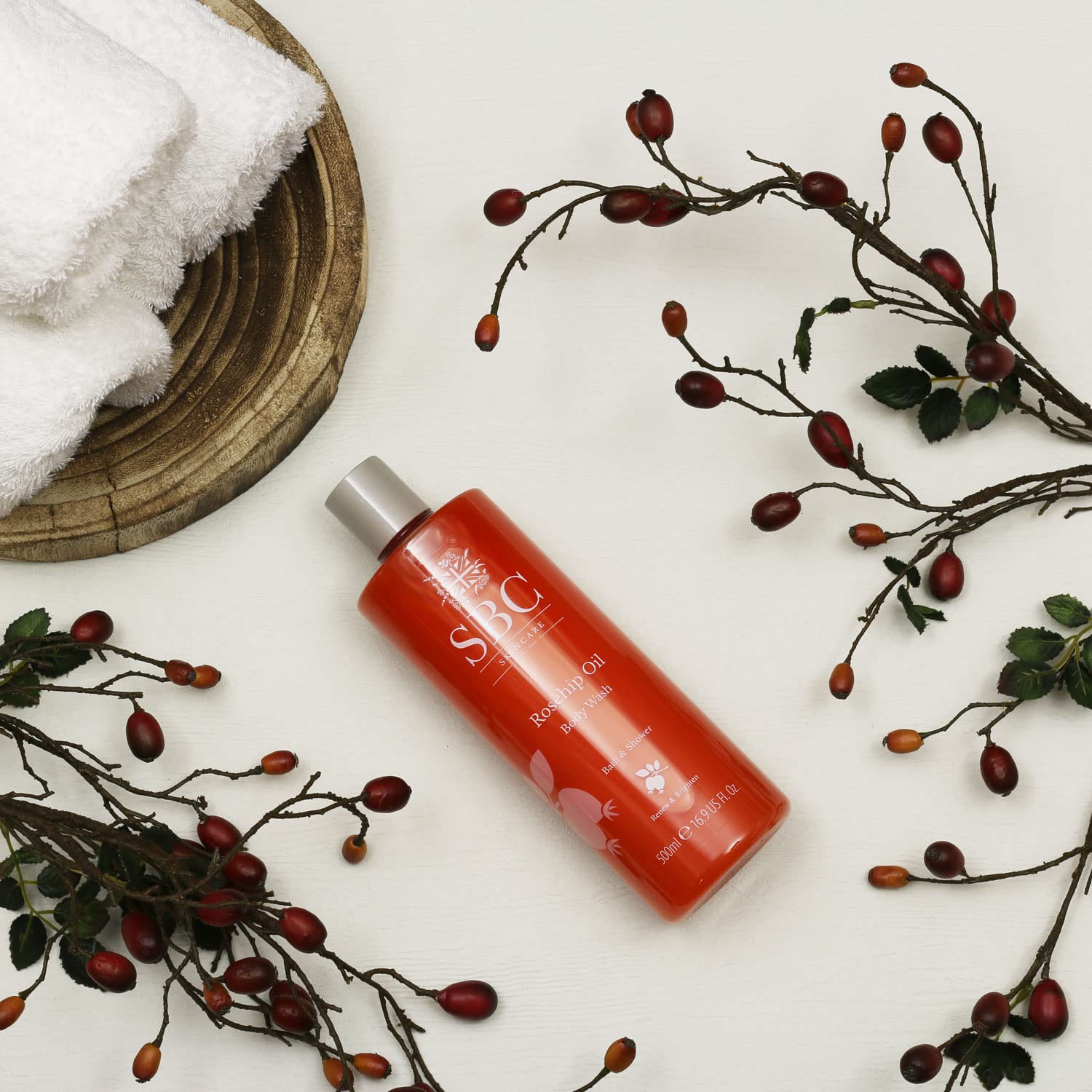 SBC Skincare Rosehip Oil Body Wash 300ml, Anti-Ageing Bath and Shower Body Wash with Rosehip Oil and Vitamins A, C and E, Delicate Scent