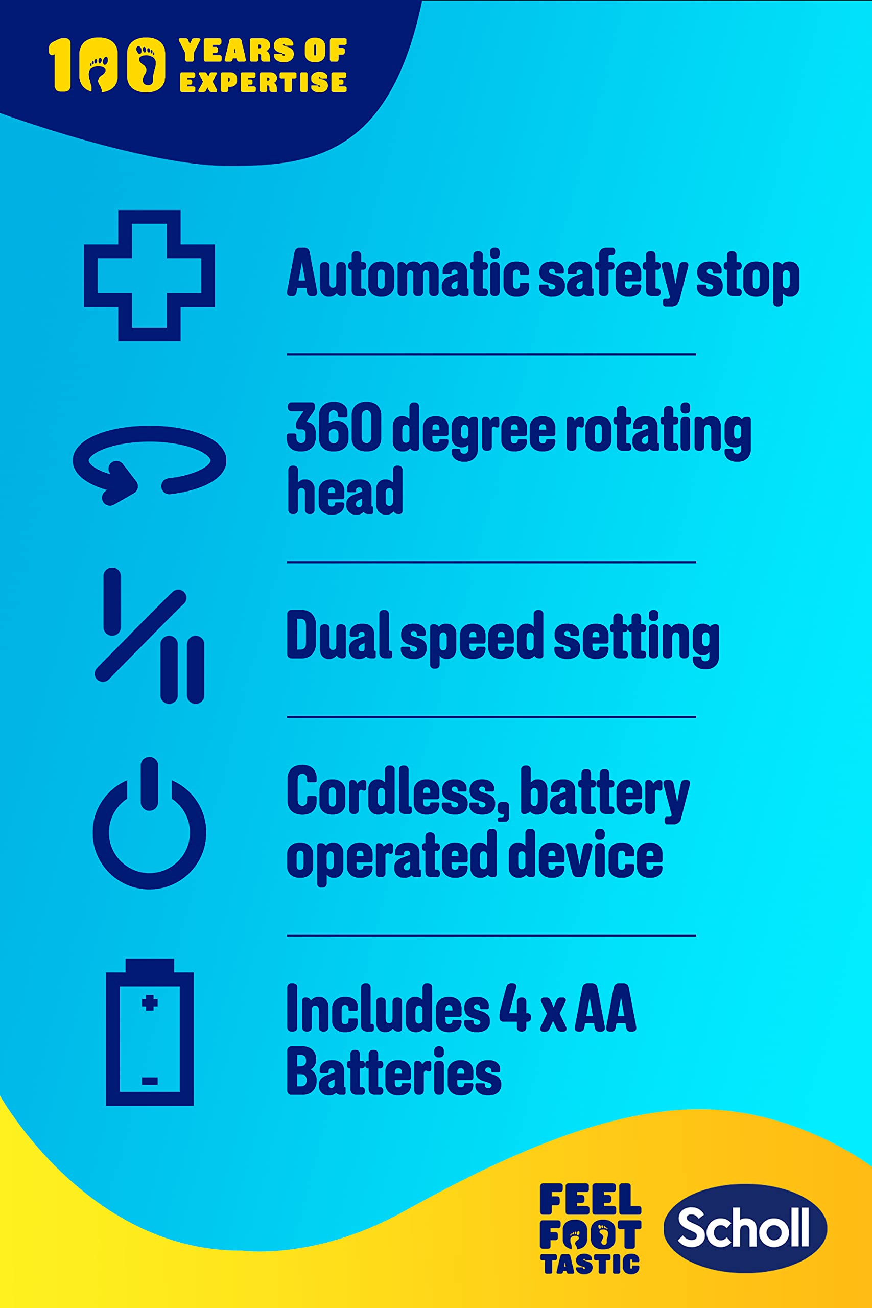 - SELF-ROTATING COARSE CRYSTAL HEAD: The Scholl Velvet Smooth System features a 360 degree self-rotating head with a coarse crystal texture which effectively removes dead and dry skin from your feet; completely pain-free! Choose your desired speed setting and step out confidently this summer with Scholl. Includes 4xAA batteries