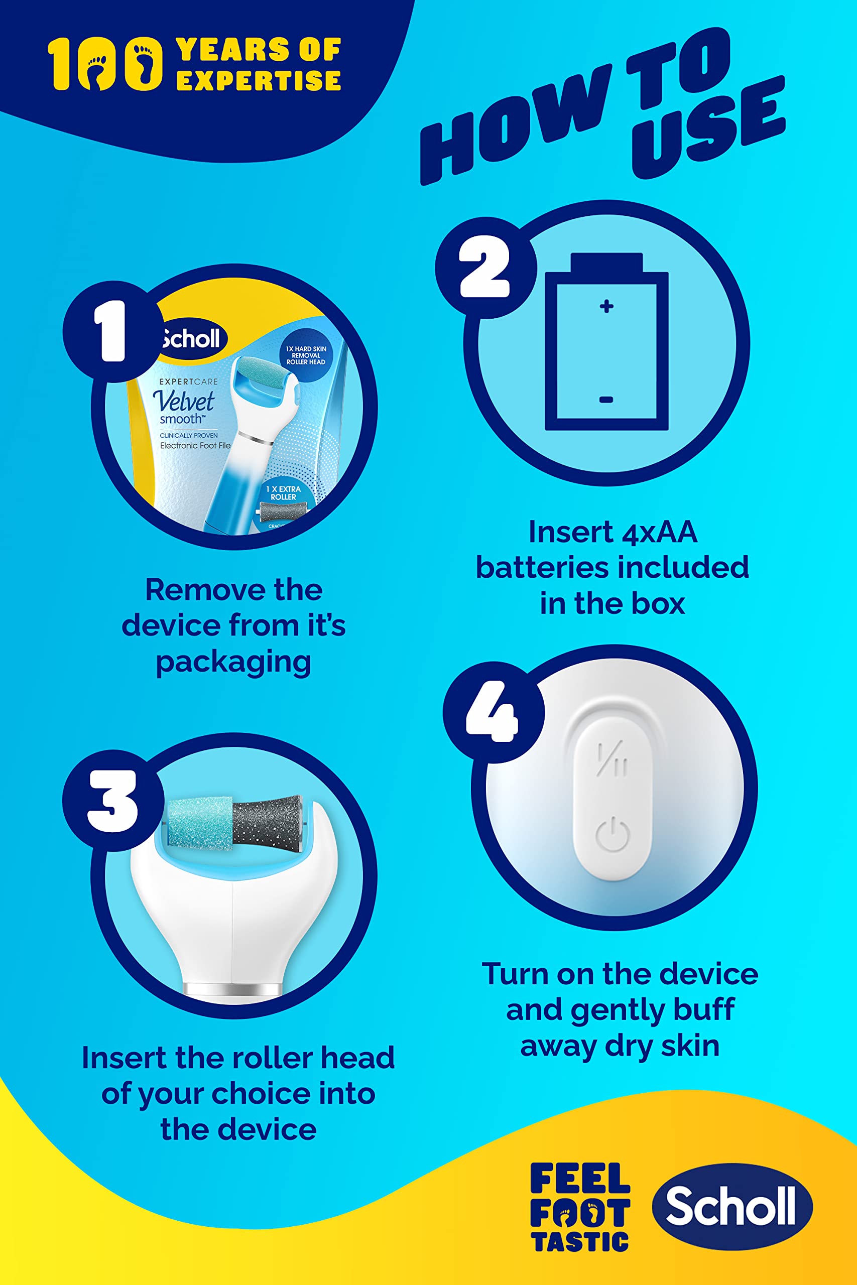 - SCHOLL VELVET SMOOTH PEDICURE SYSTEM: Achieve silky-smooth feet in minutes with the Scholl Velvet Smooth Electronic Foot File System. Quickly buff away hard and dry skin with this handheld exfoliator featuring a lightweight, ergonomically designed soft-touch handle ideal for one-handed use. Available in blue