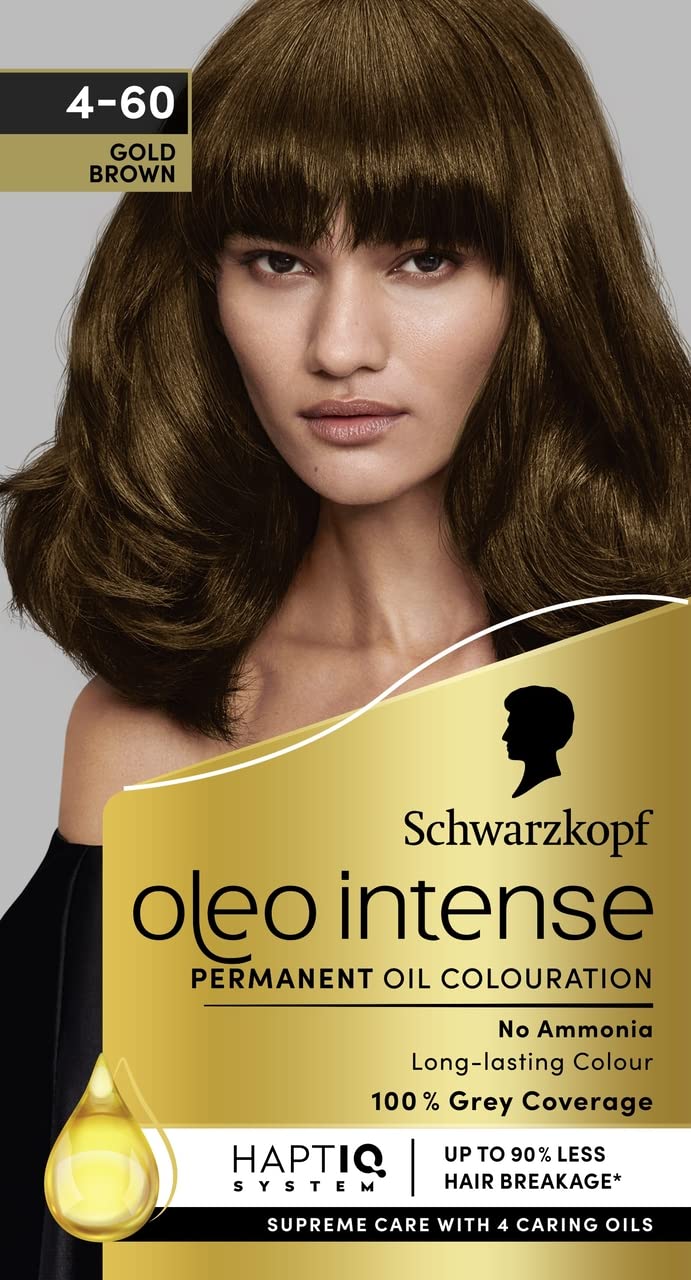 Schwarzkopf Oleo Intense Permanent Oil Colour 4-60 Gold Brown Hair Dye, 100% Grey Coverage, Conditioner with HaptIQ System, Long-Lasting Colour, Ammonia Free Hair Dye