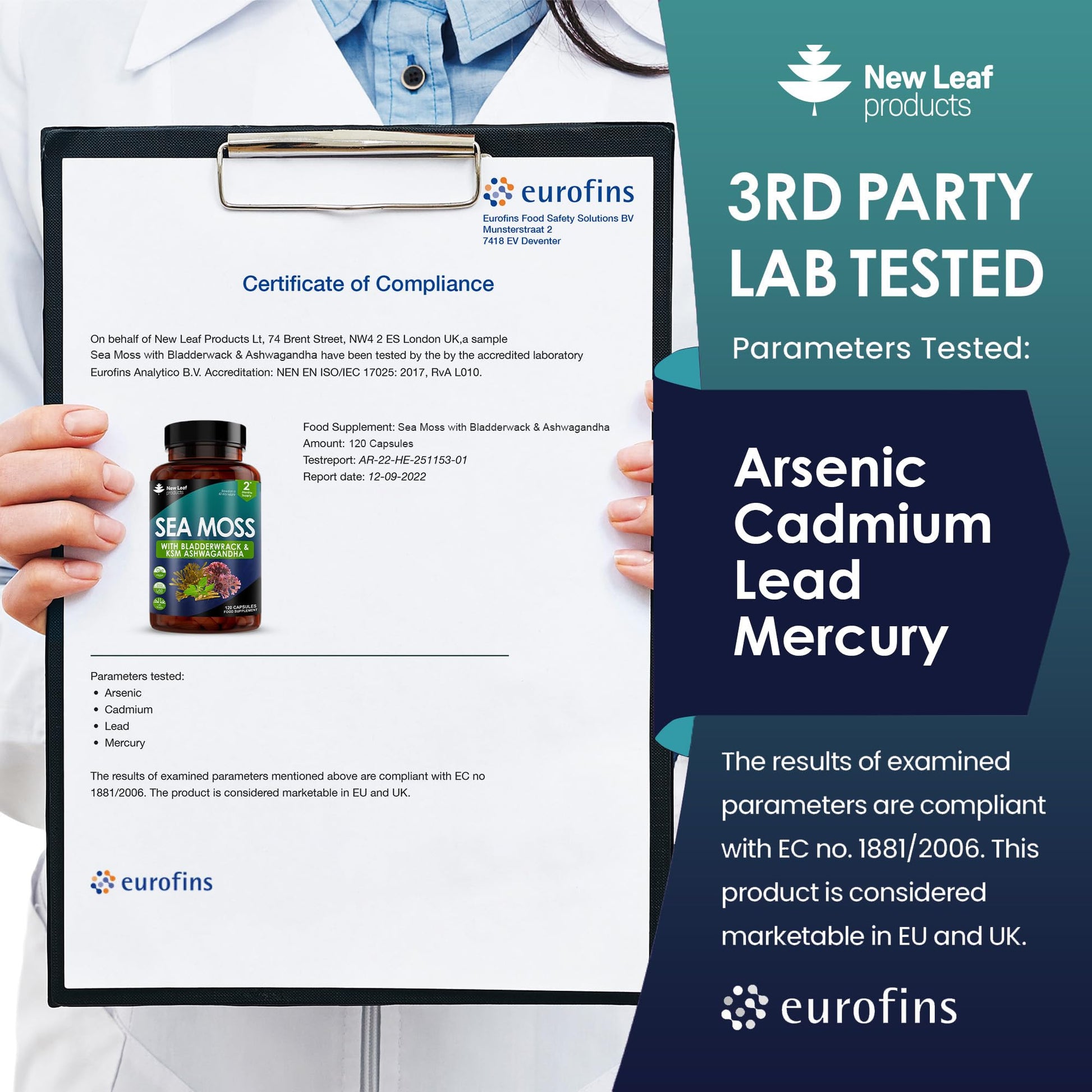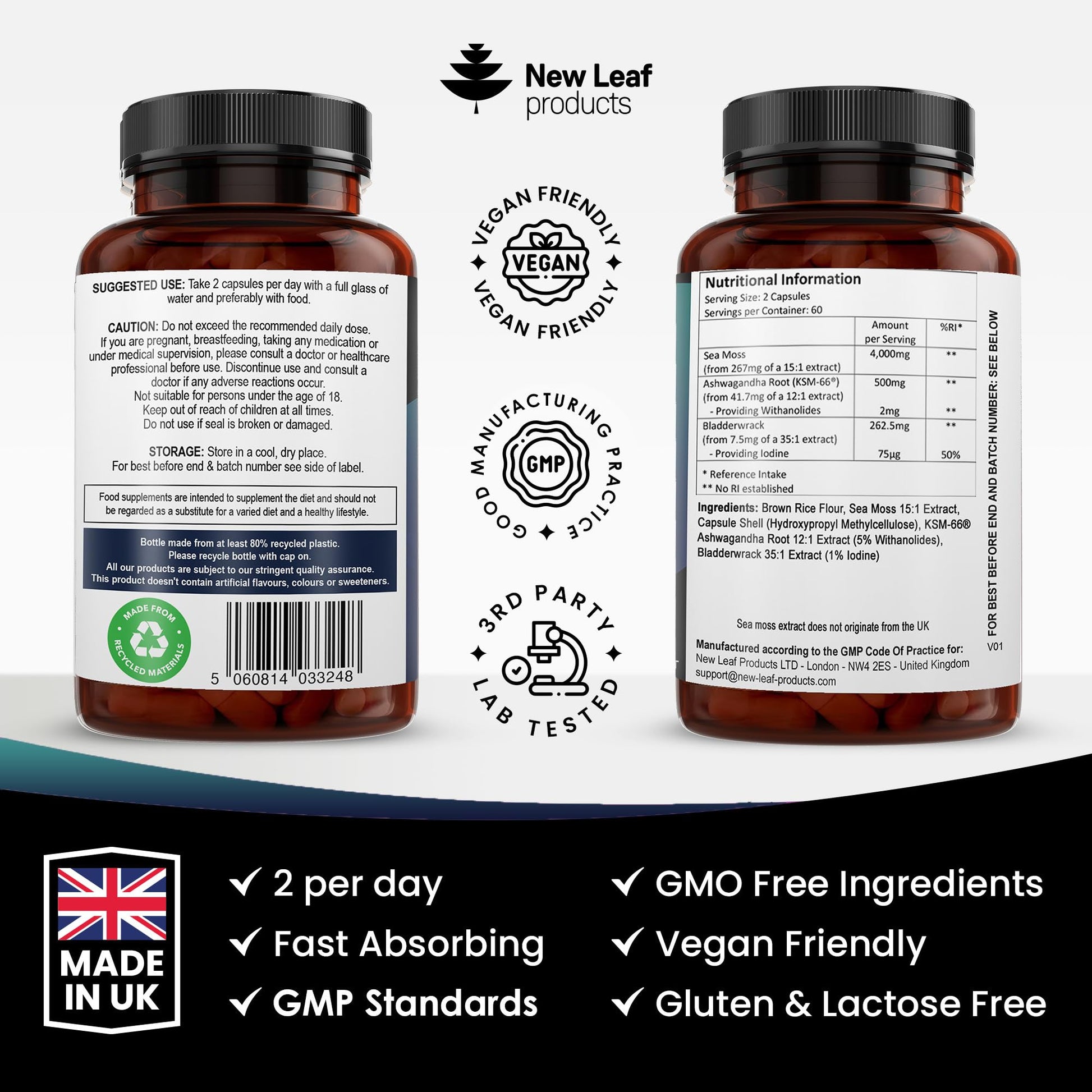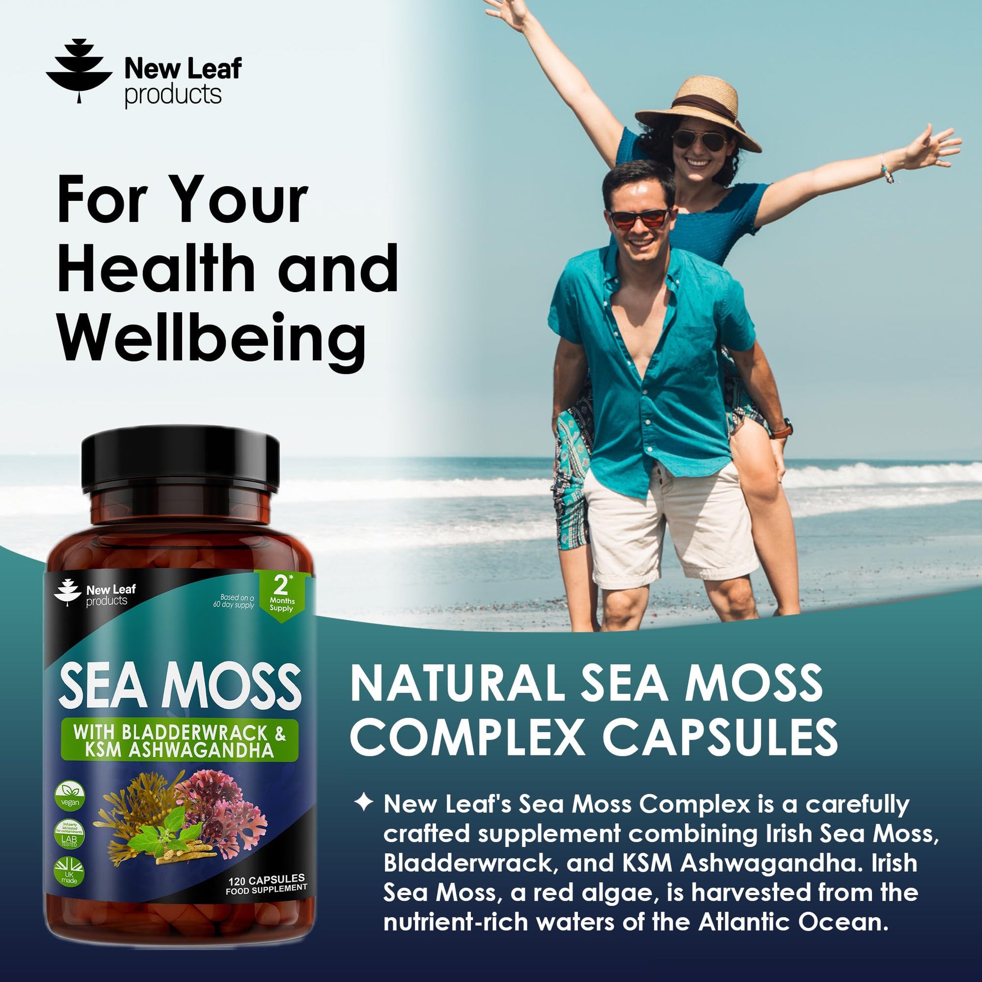 Sea Moss Complex - Pure Irish Sea Moss Capsules with Bladderwrack & KSM Ashwagandha - High Strength Sea Moss Capsule - 120 Fill Vegan Irish Sea Moss Capsules Made in The UK by New Leaf
