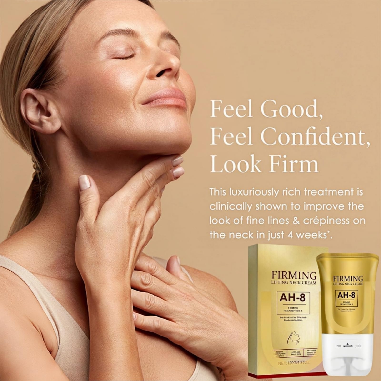 AH-8 Neck Firming Cream with Precision Roller : Designed to hug the neck’s natural contours, the lightweight formula enhances absorption while minimizing the look of wrinkles.The non-greasy, fast-absorbing texture leaves no residue, allowing skin to breathe while delivering essential nutrients for firmness. It leaves the neck feeling soft, revitalized, and primed with the hydration needed to maintain a youthful, tightened appearance. Restores a youthful appearance with consistent use