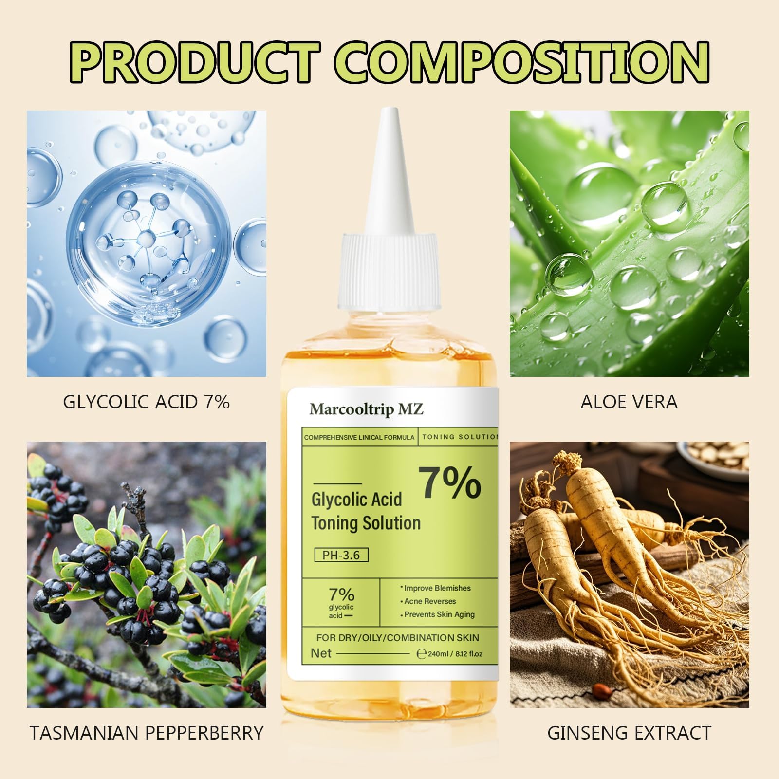 - Powerful 7% Glycolic Acid Toner: Our formula containing 7% glycolic acid effectively exfoliates dead skin cells, unclogs pores, and reduces blemishes.