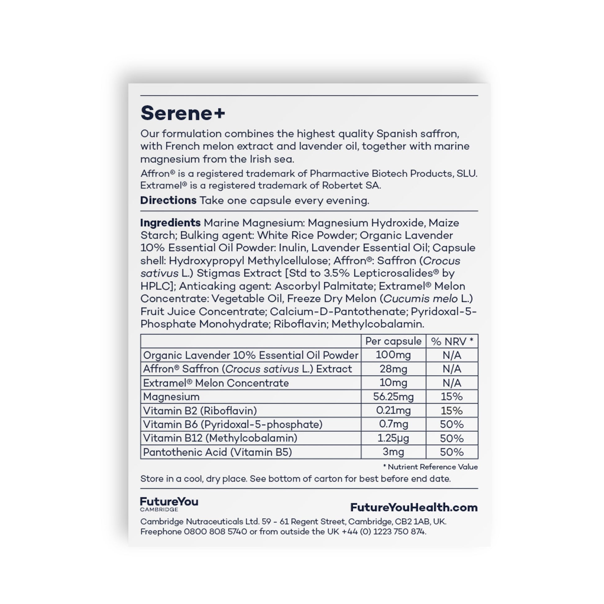 Discover tranquility with FutureYou Serene+ (28 Capsules), a natural sleep aid meticulously crafted to promote restful sleep, support mood, and elevate energy levels. From FutureYou Cambridge Supplements, this formulation is a testament to our commitment to supporting healthier lives through the power of science. Serene+ stands out with carefully selected, high-quality ingredients, including natural Spanish saffron, French melon extract, lavender, and magnesium. Affron, a highly absorbable Spanish saffron variety, addresses occasional stress, while Extramel, a patented extract from a unique French Cantaloupe melon, enriches the formula with antioxidants. This blend is a symphony of nature's gifts for enhanced wellbeing. Experience the calming embrace of organic lavender oil from France, renowned for its relaxing properties. Infused into Serene+, this essential oil promotes relaxation, creating an ideal environment for a tranquil night's sleep. Complementing this, a natural form of magnesium, sourced from the Irish Sea, works to reduce tiredness, aiding in achieving a restful sleep. With a 28-day supply, taking care of your wellbeing is as simple as taking one tablet every evening. Bid farewell to fatigue and welcome vitality into your life effortlessly. These vegetarian and vegan-friendly magnesium sleep supplements are also free from gluten and lactose, accommodating diverse dietary preferences. Trust in FutureYou Supplements, headquartered in the esteemed city of Cambridge, a global hub of research and innovation. Our multivitamins and minerals are backed by scientific data, ensuring that your wellbeing is in safe hands. Choose Serene+ for a natural approach to restful sleep and let FutureYou be your partner in the pursuit of optimal wellbeing.More Info