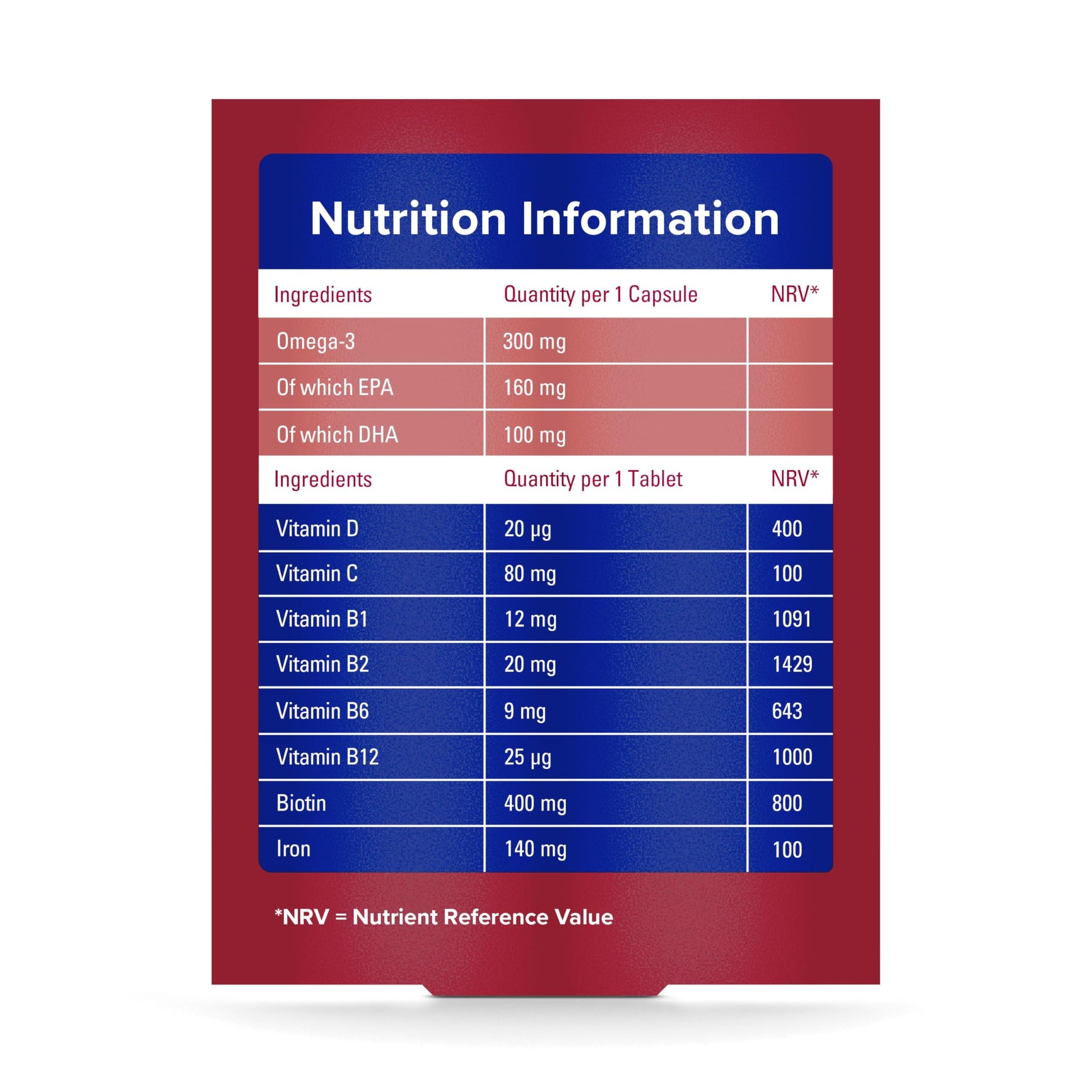 - 2-IN-1 COMBINATION PACK FOR WHOLE BODY HEALTH⁺: With 22 vitamins and minerals – including Biotin, Iron, Vitamin D, Vitamin C, Vitamin B12 – paired with 300mg high quality Omega-3
