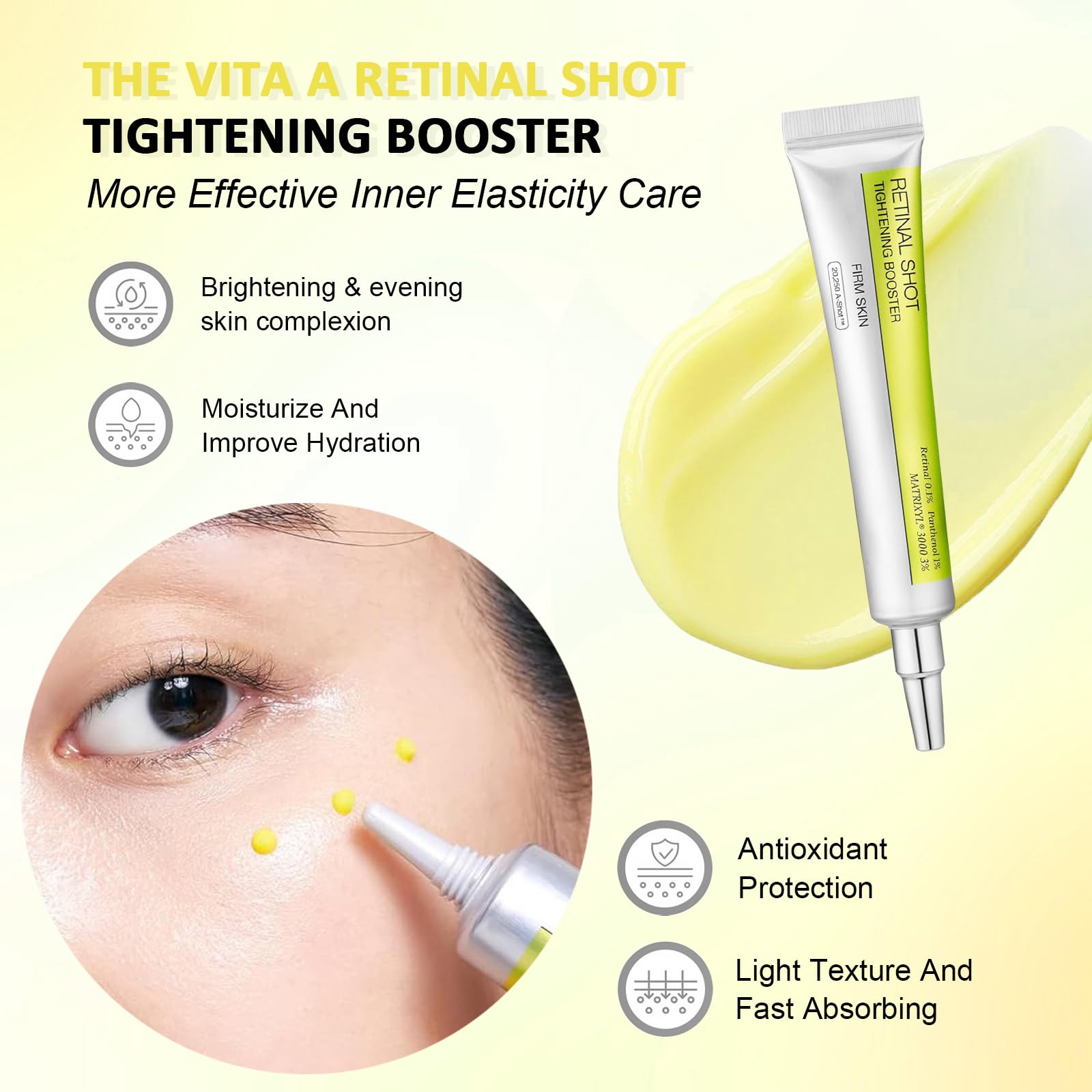 Tired of puffy eyes, stubborn wrinkles, and shadows? Our Vita A Retinal Shot Tightening Booster delivers targeted rejuvenation for brighter, firmer-looking eyes. Retinol serum for face crafted for delicate contours, it harnesses potent actives to renew skin at its core—without compromise.