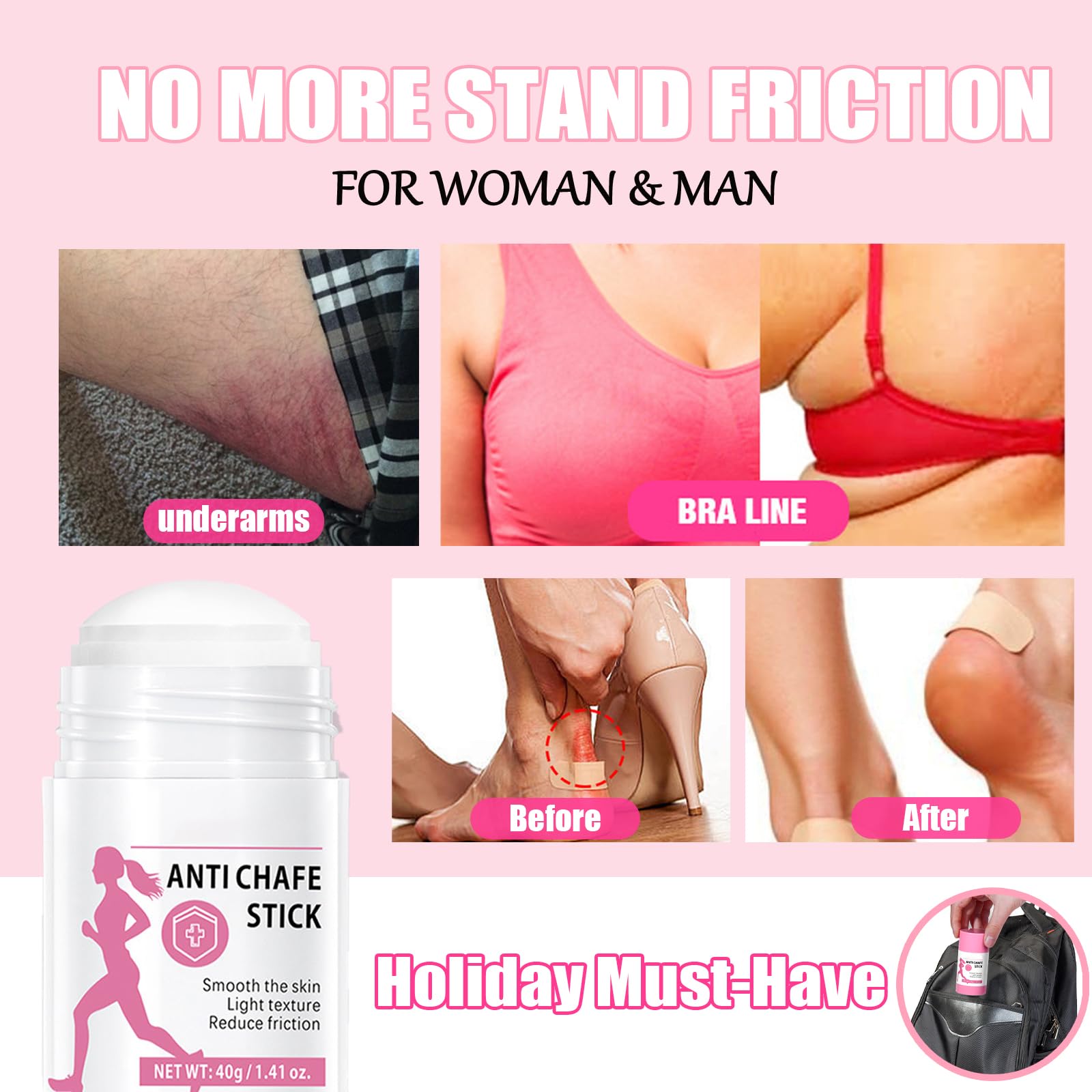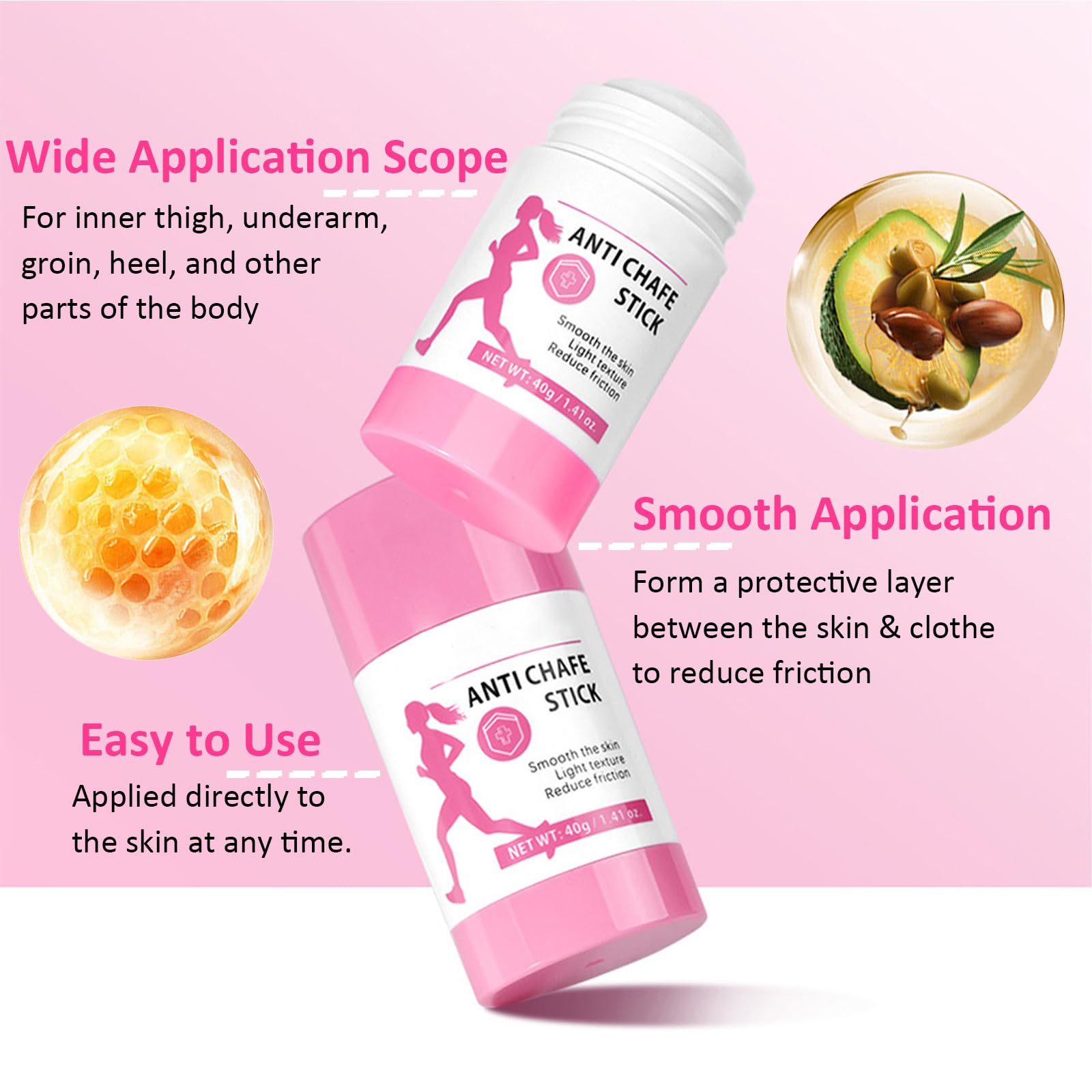 Simply apply the anti chafing stick directly to areas prone to chafing,before getting dressed or heading out. Reapply as needed, especially after sweating or swimming.