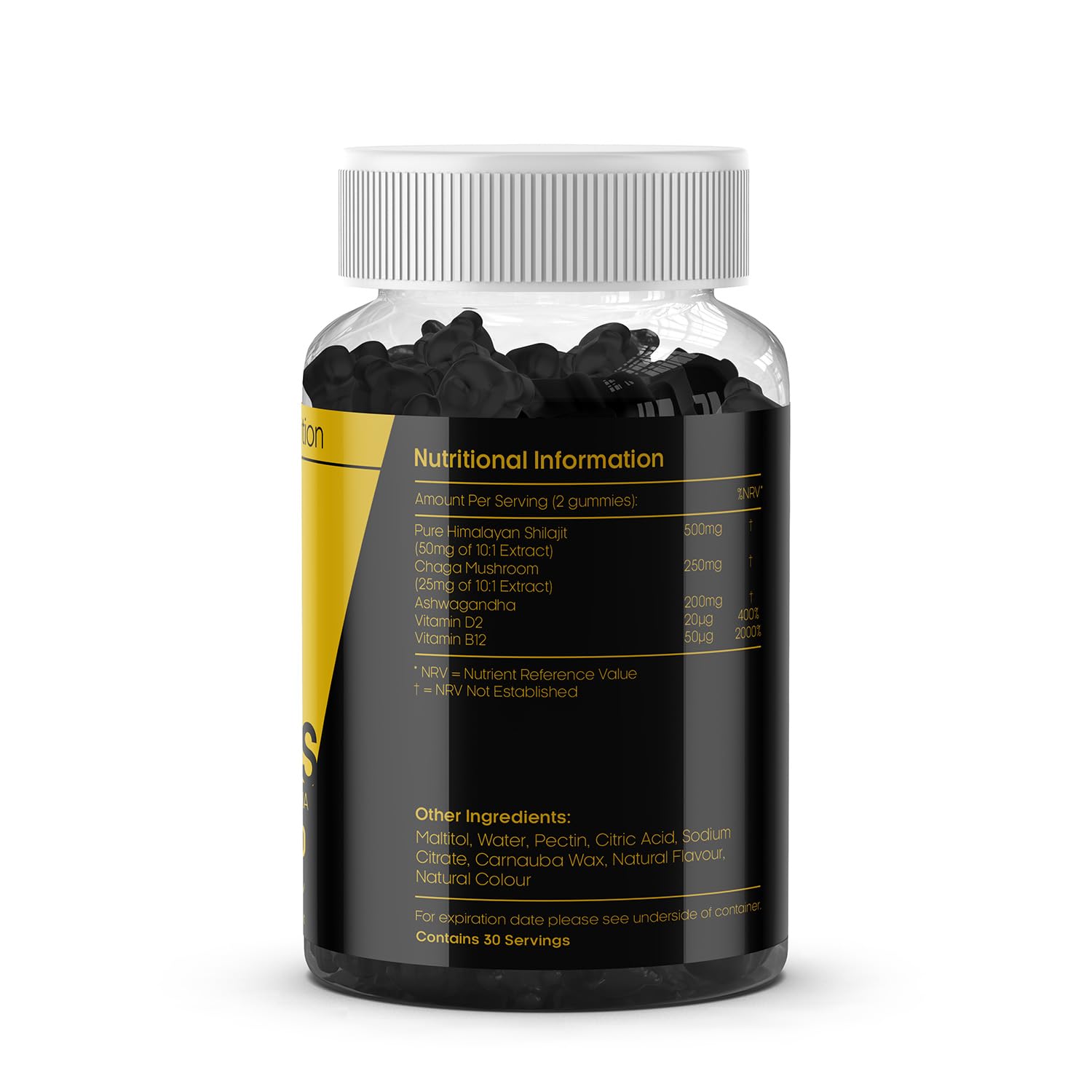 Discover the power of nature with our Shilajit Gummies. Each serving of 2 gummies is packed with 500mg of pure Himalayan Shilajit, 250mg of nutrient-rich Chaga Mushroom, and 200mg of calming Ashwagandha. Our Shilajit Gummies are designed to boost your energy, enhance your well-being, and support overall health. Enjoy the benefits of these potent ingredients in a delicious, convenient gummy form. Elevate your daily routine with our Shilajit Gummies and experience the natural vitality they bring.More Info