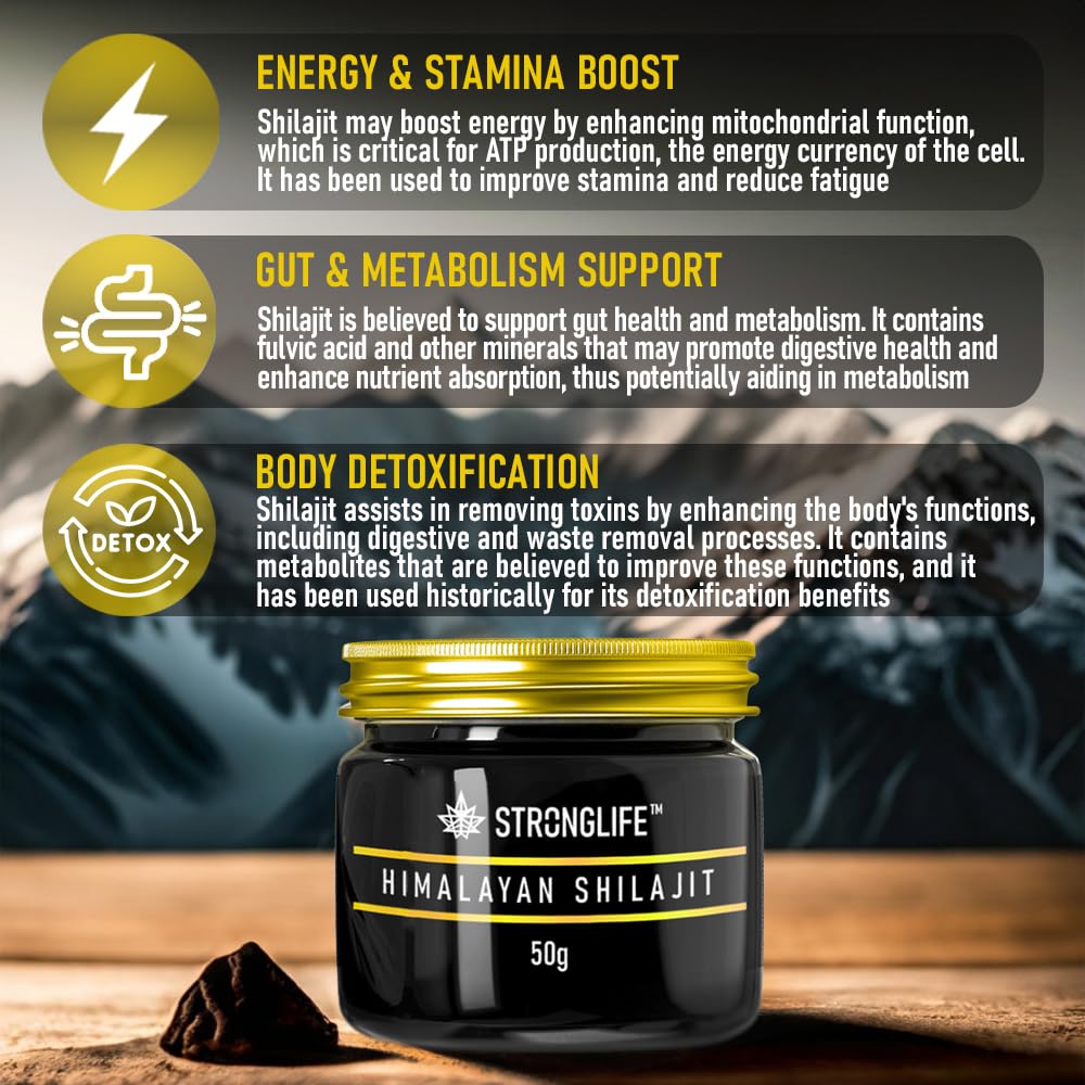 Shilajit Resin 50 Grams Stronglife Gold Grade Himalayan Shilajit | Natural Source of Fulvic Acid & 85+ Minerals for Energy Stamina Immune System | UK Lab Certified