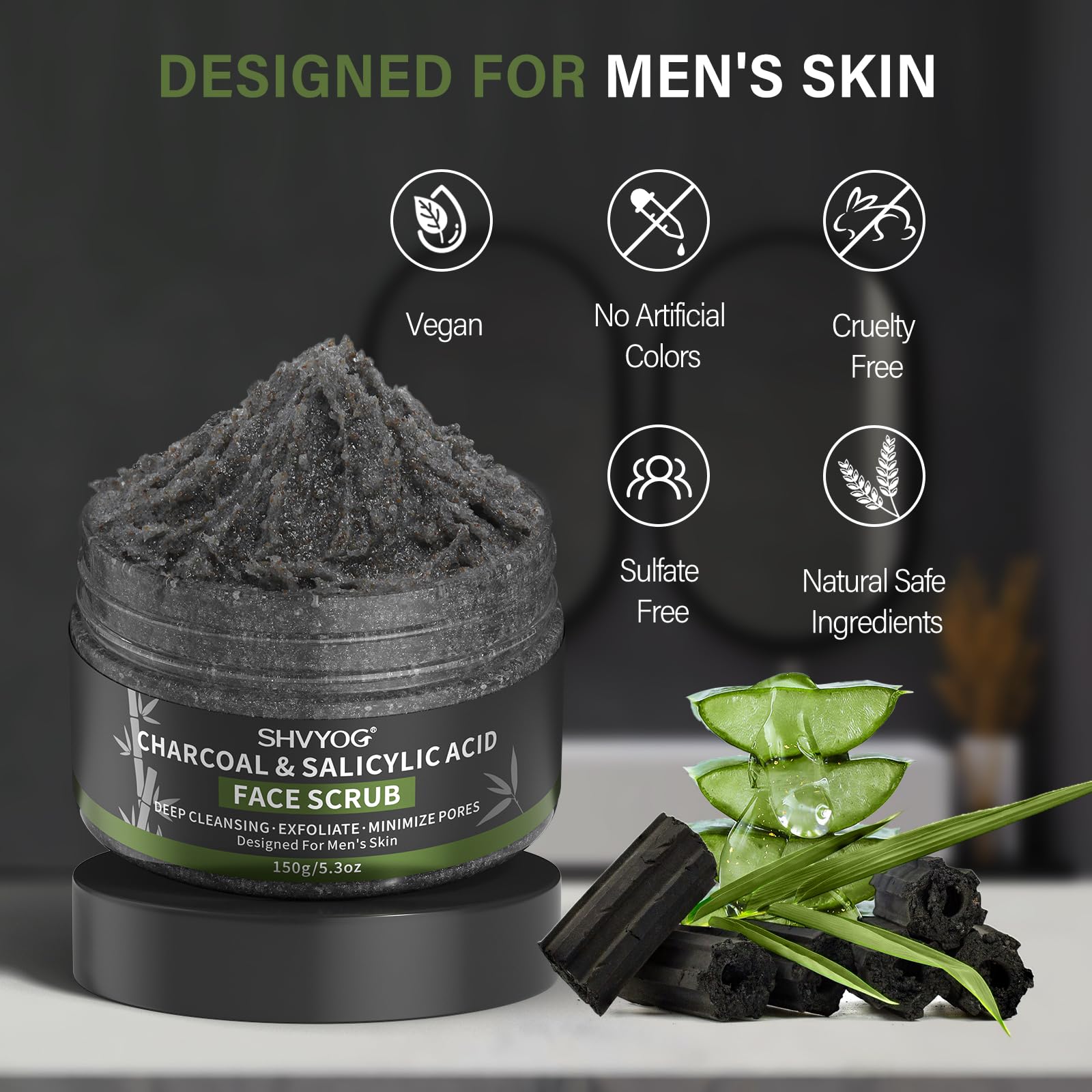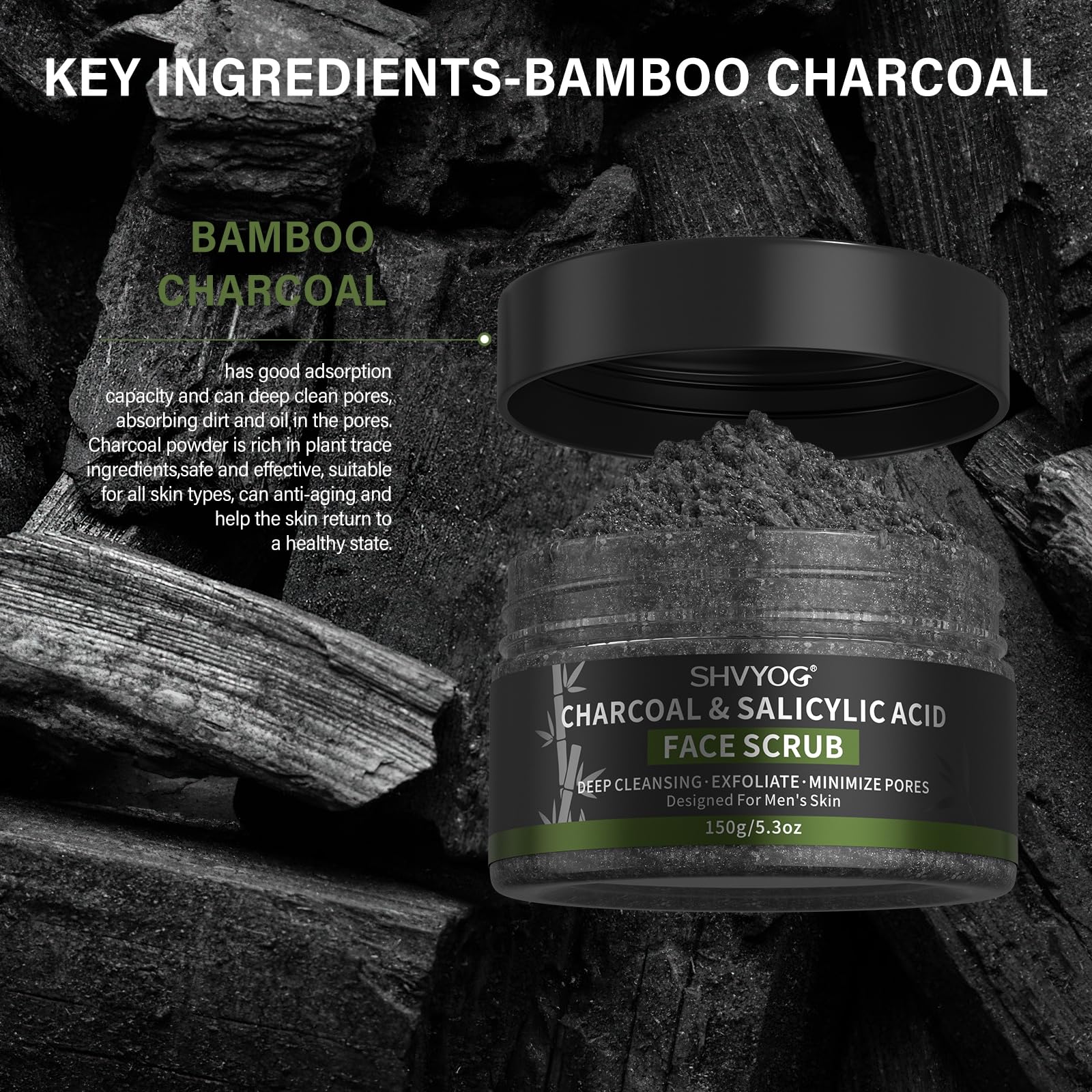 SHVYOG Men's Face Scrub, Bamboo Charcoal Salicylic Acid Face Exfoliant, Facial Peeling Improves Blackheads, Acne, Clogged Pores, Cleansing Oil Control, Pre-shave Care for Men, with Facial Cleansing Brush