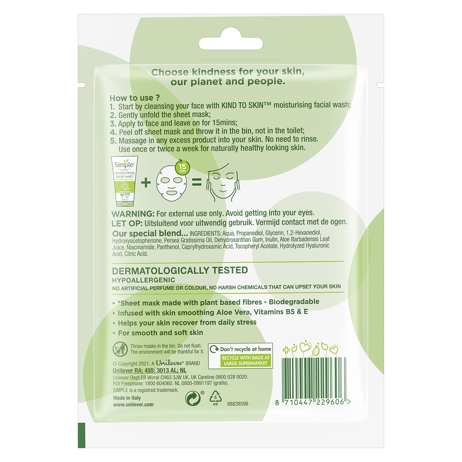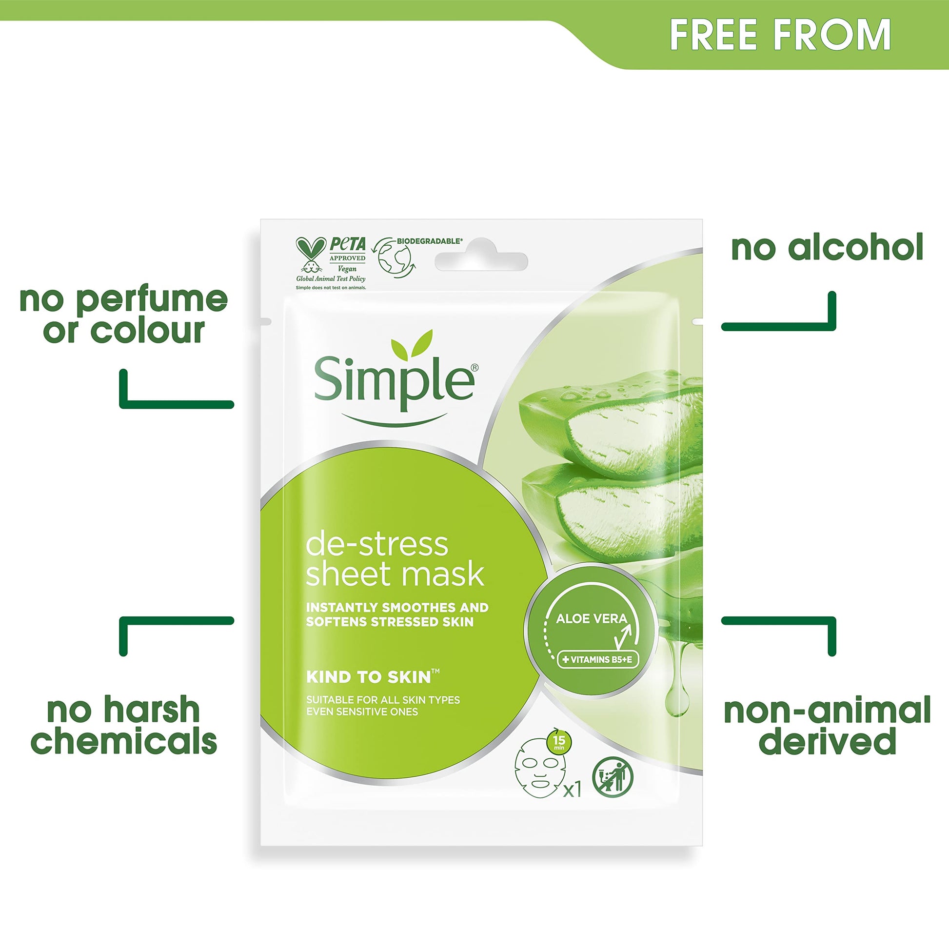 - Simple Kind to Skin De-Stress Sheet Mask helps to reduce the appearance of tired, stressed skin in just 15 mins with no messy application