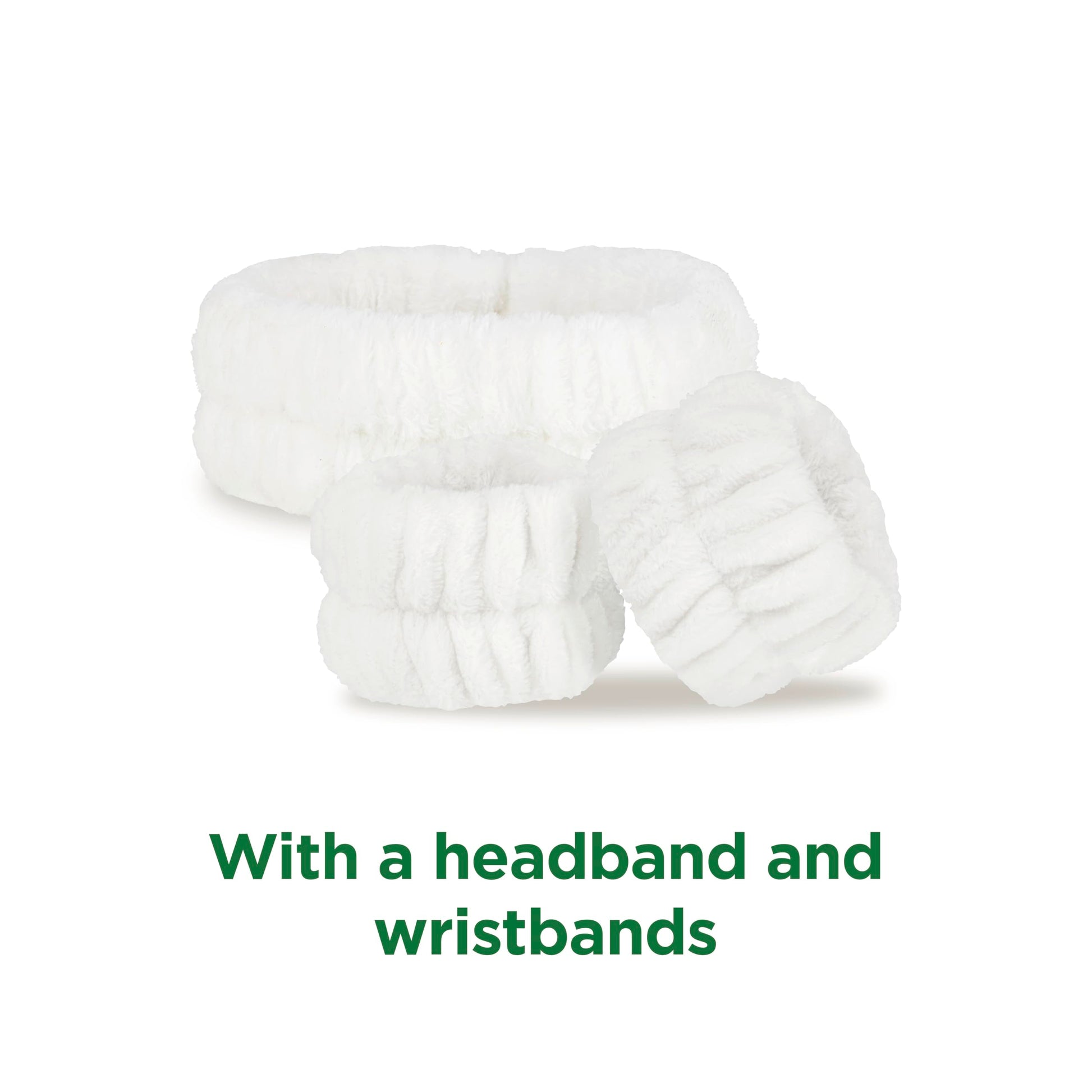 - Our wristbands prevent water from running down the arms during face washing, and the headband keeps hair out of the way when applying the sheet masks