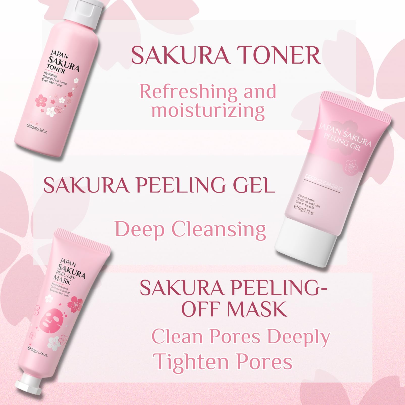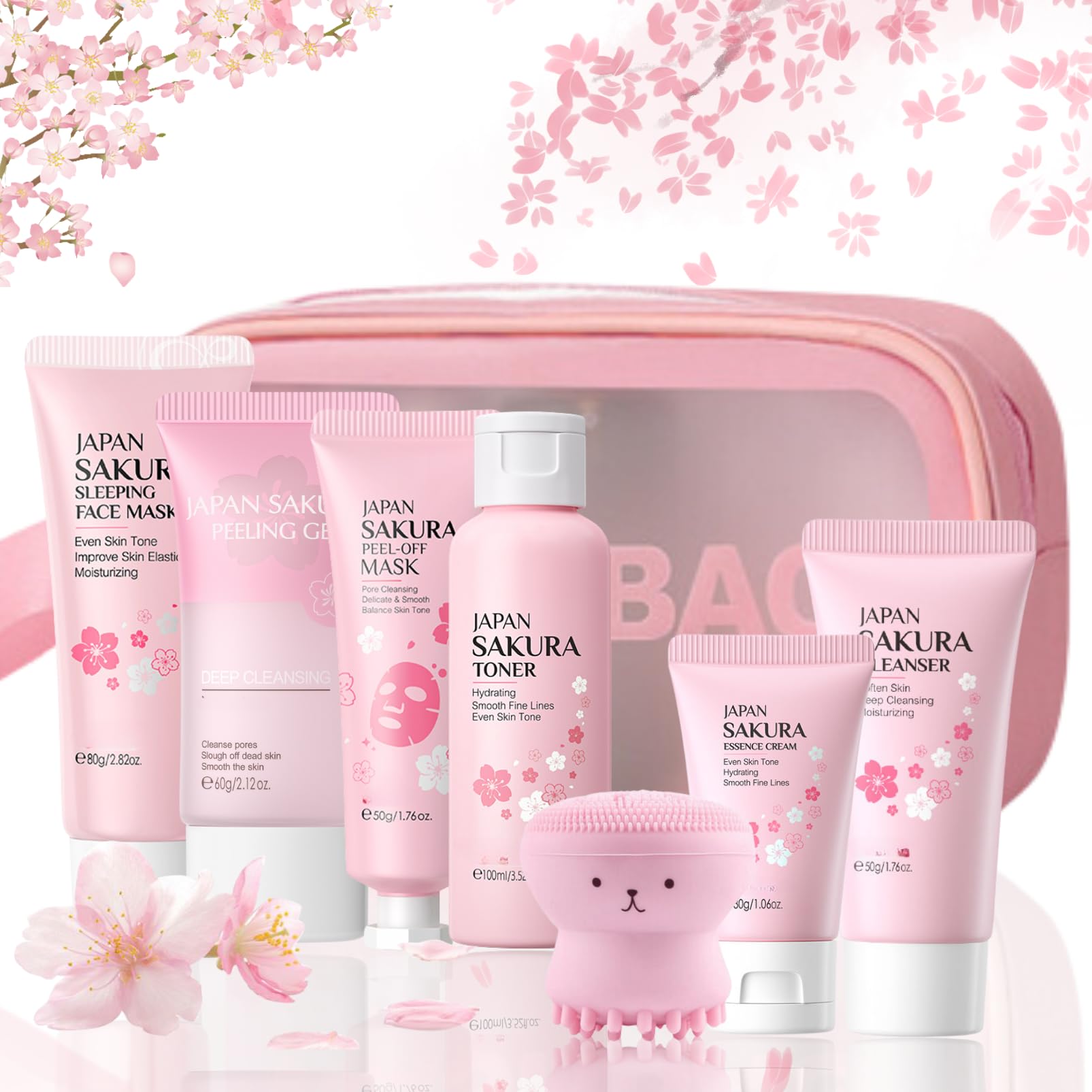 Skin Care Sets & Kits - Skincare for Teenage Girls Gift Set - Face Care For Pores,Exfoliate,Sakura Travel Kit - Mask,Peel Mask,Toner,Gel,Cleanser,Cream,Facial Cleansing Brush,Bag(8pcs)