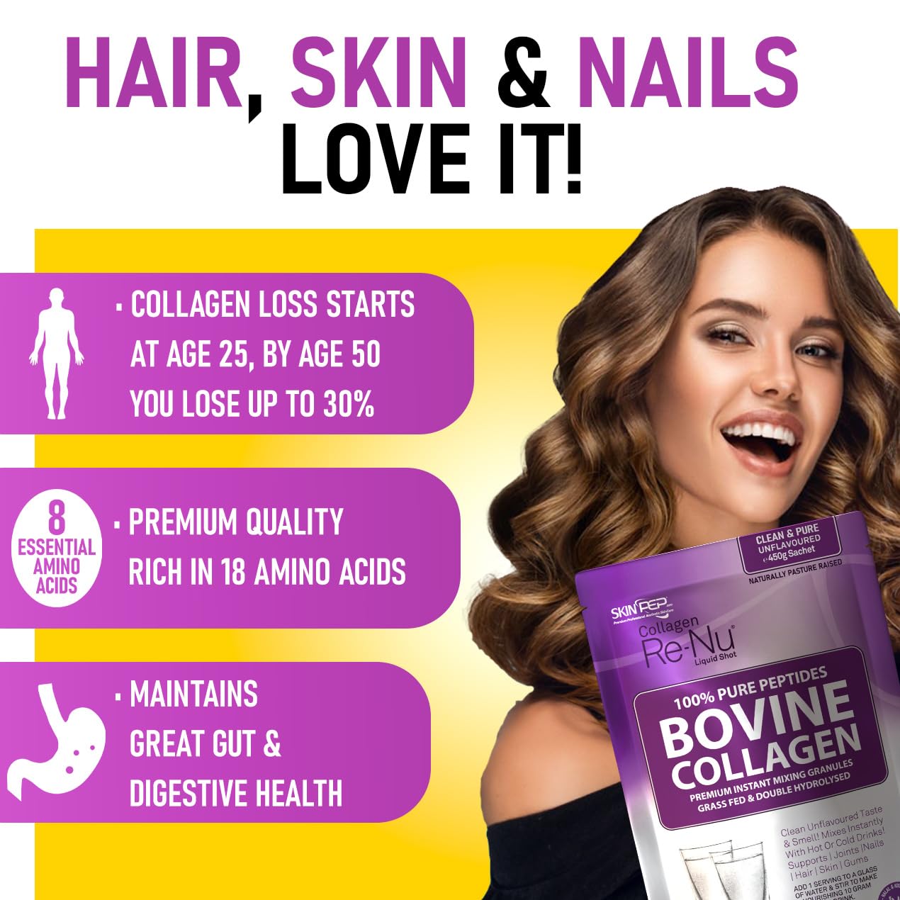 Skin Pep Collagen Powder 450g, Ultra Premium Hydrolysed Bovine Collagen Peptides by SkinPep - Halal & Kosher - High Levels of The 8 Essential Amino Acids, Collagen Supplements, Made in UK
