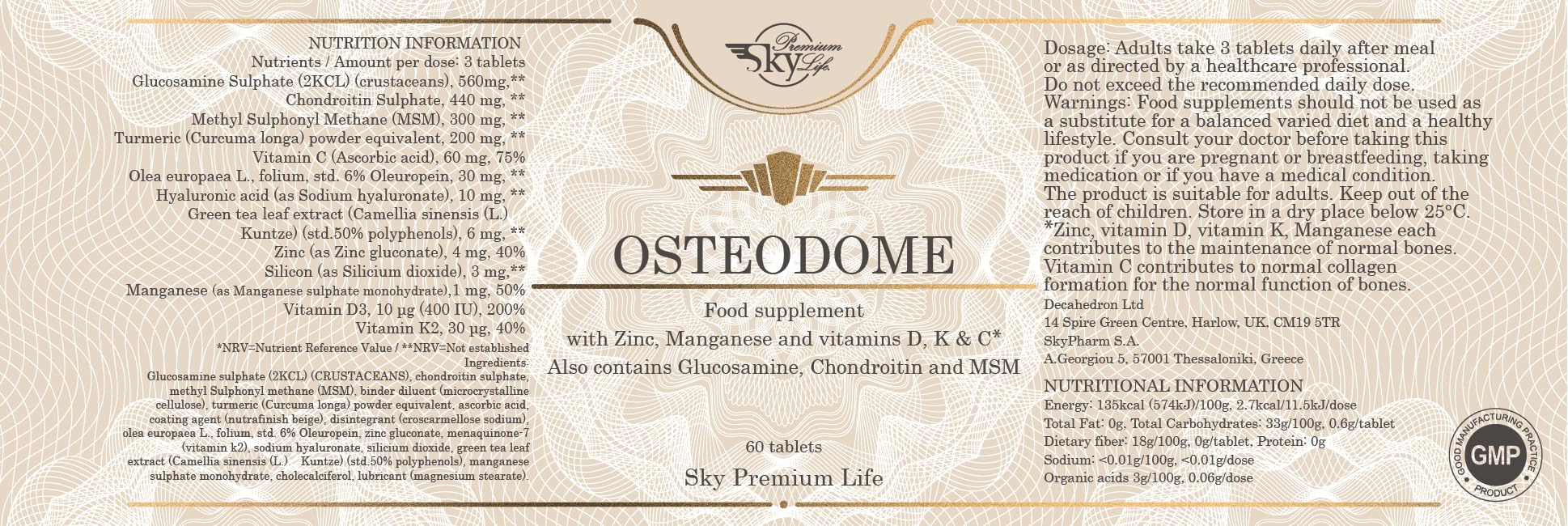 Sky Premium Life Osteodome Food Supplement – Multivitamin and Mineral Complex with Glucosamine and Chondroitin, MSM, Hyaluronic Acid, Green Tea – 60 Tablets
