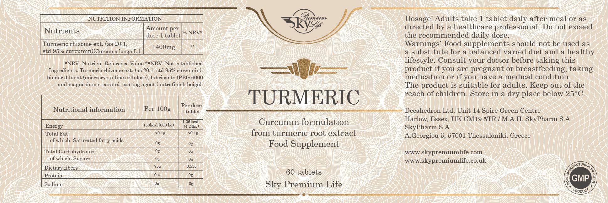 Sky Premium Life Turmeric 1400mg Food Supplement - Curcumin Formulation from Turmeric Root Extract - 60 Tablets
