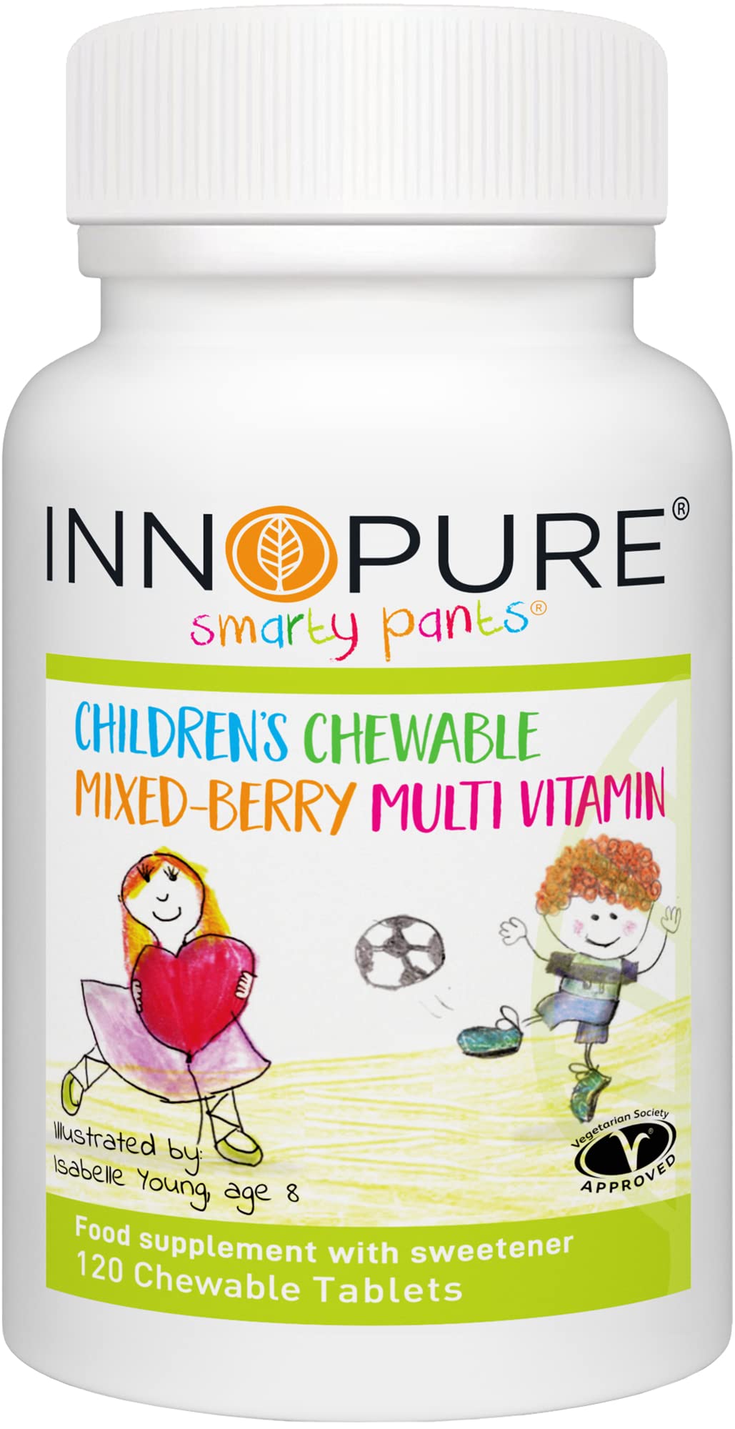 Innopure SmartyPants Kids vitamins contains all 8 essential B Vitamins, Vitamin D3, Vitamin C and Vitamin E. With added Iron to contribute to the normal growth of children. Great tasting Mixed Berry Flavour chewable tablets that kids love.