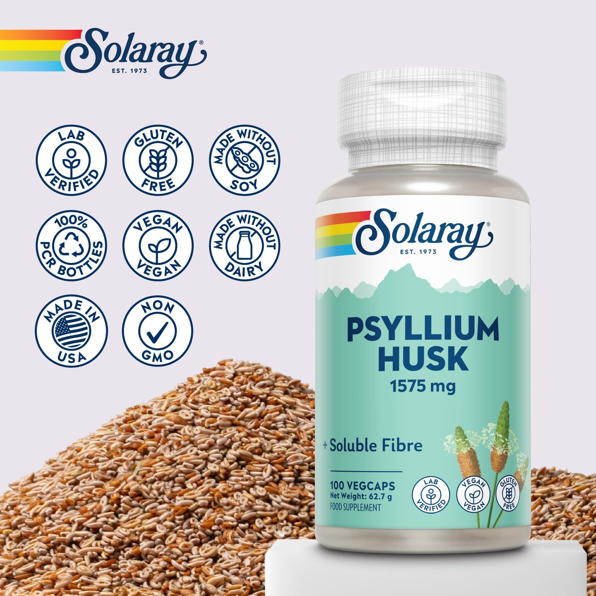 SOLARAY Psyllium Husk - 100 Vegan Capsules not Powder - Fibre Supplement - Natural Soluble Fiber from Plantago Ovata - High Strength Physillan Husk - Lab Verified - Solaray