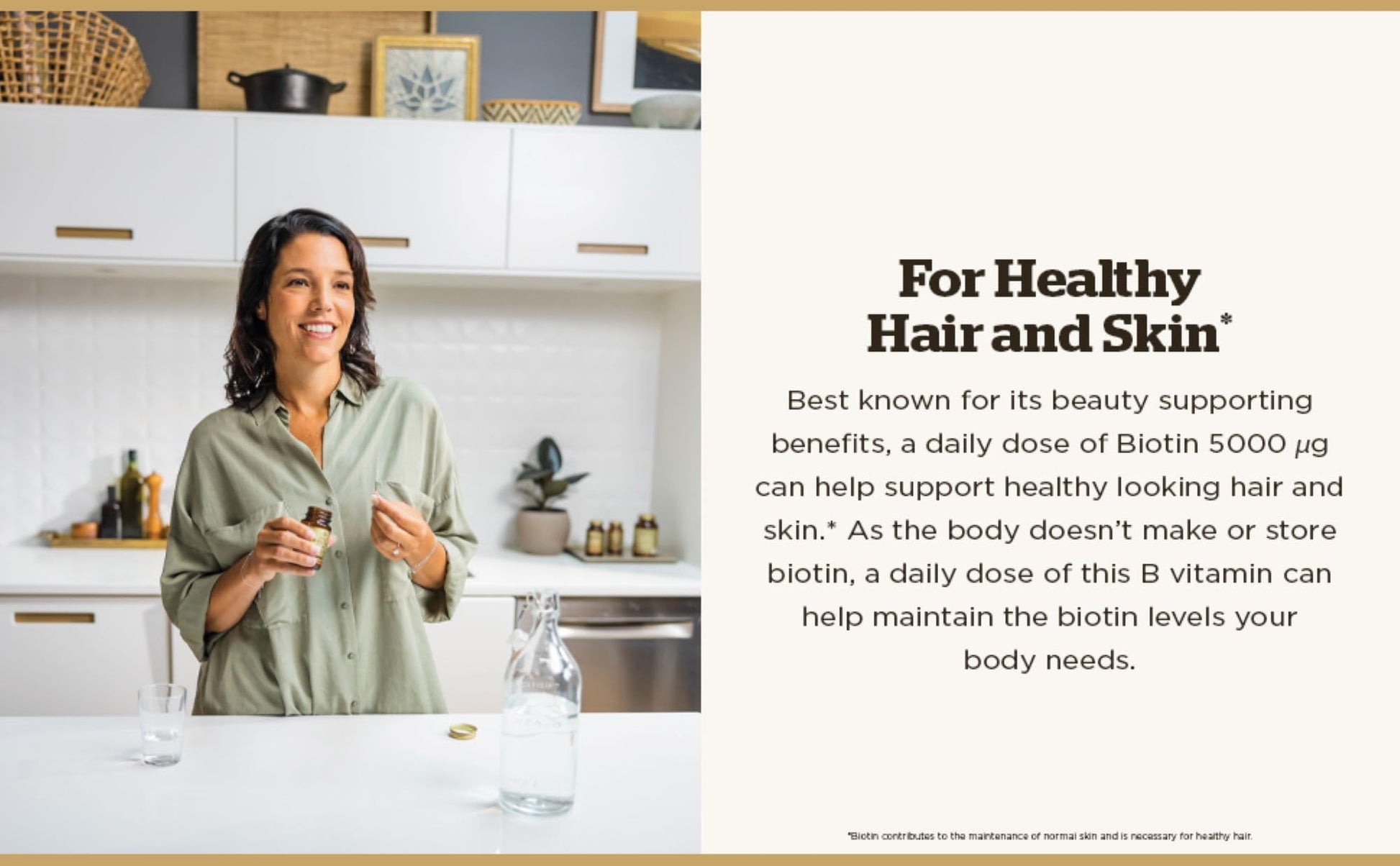 - HIGH STRENGTH FORMULA; Perhaps best known for its beauty supporting benefits, a daily dose of Solgar's Biotin 5000 mcg can help support healthy looking hair, skin and maintains energy-yielding metabolism and general vitality