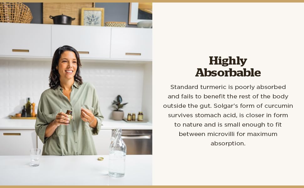 - ✓BETTER AND FASTER ABSORPTION - Solgar Full Spectrum Curcumin 185x is the most absorbable form of turmeric with 185x better take up into the body than other forms of turmeric. Solgar's form of curcumin survives the stomach acid, is closer in form to nature and is small enough to fit between microvilli for maximum absorption
