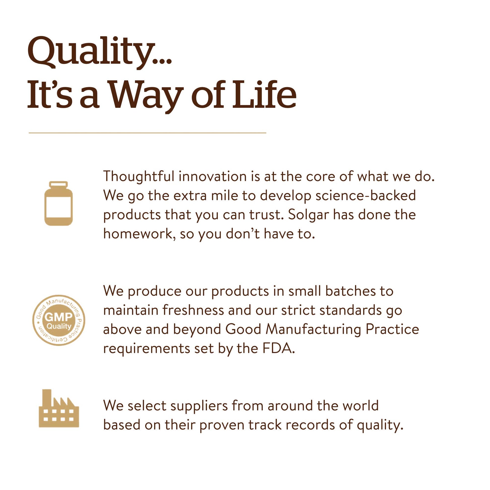 - ✓ GOLD STANDARD - All Solgar products meet our industry recognized “Gold Standard” for excellence, made using naturally sourced ingredients and innovating since 1947
