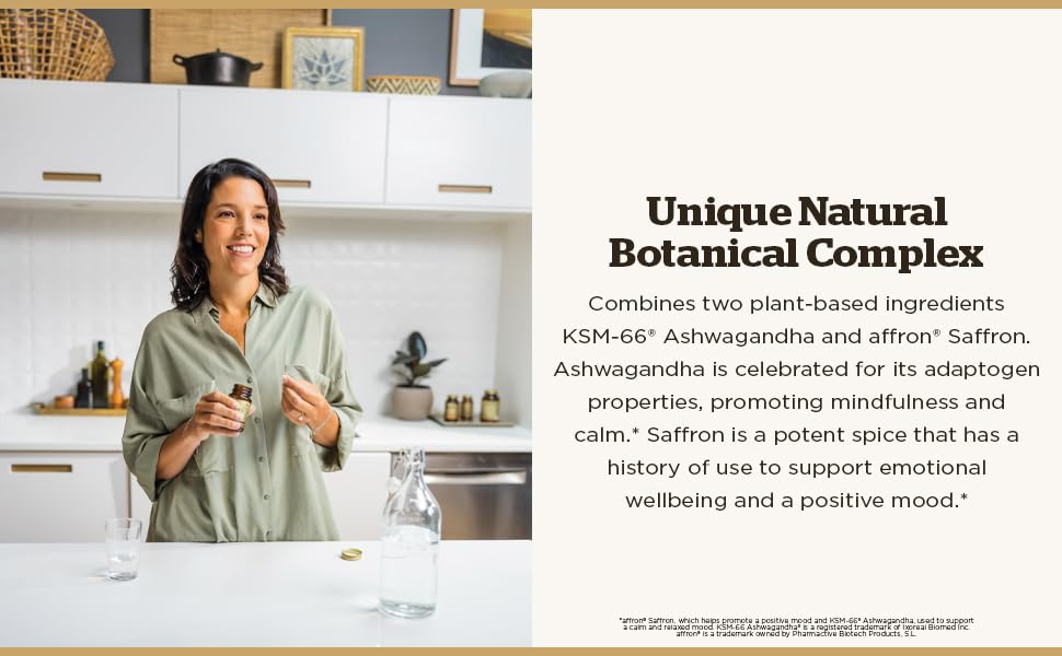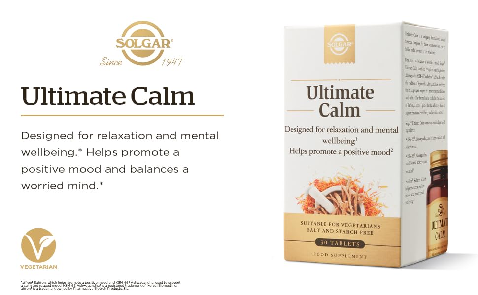 - ✓ PROMOTES MINDFULNESS AND CALM - Designed to balance a worried mind, Solgar Ultimate Calm combines two plant-based ingredients KSM-66 Ashwagandha and affron Saffron. Rooted in the tradition of Ayurveda, Ashwagandha is celebrated for its adaptogen properties, promoting mindfulness and calm. Saffron is aa potent spice that has a history of use to support emotional wellbeing and a positive mood