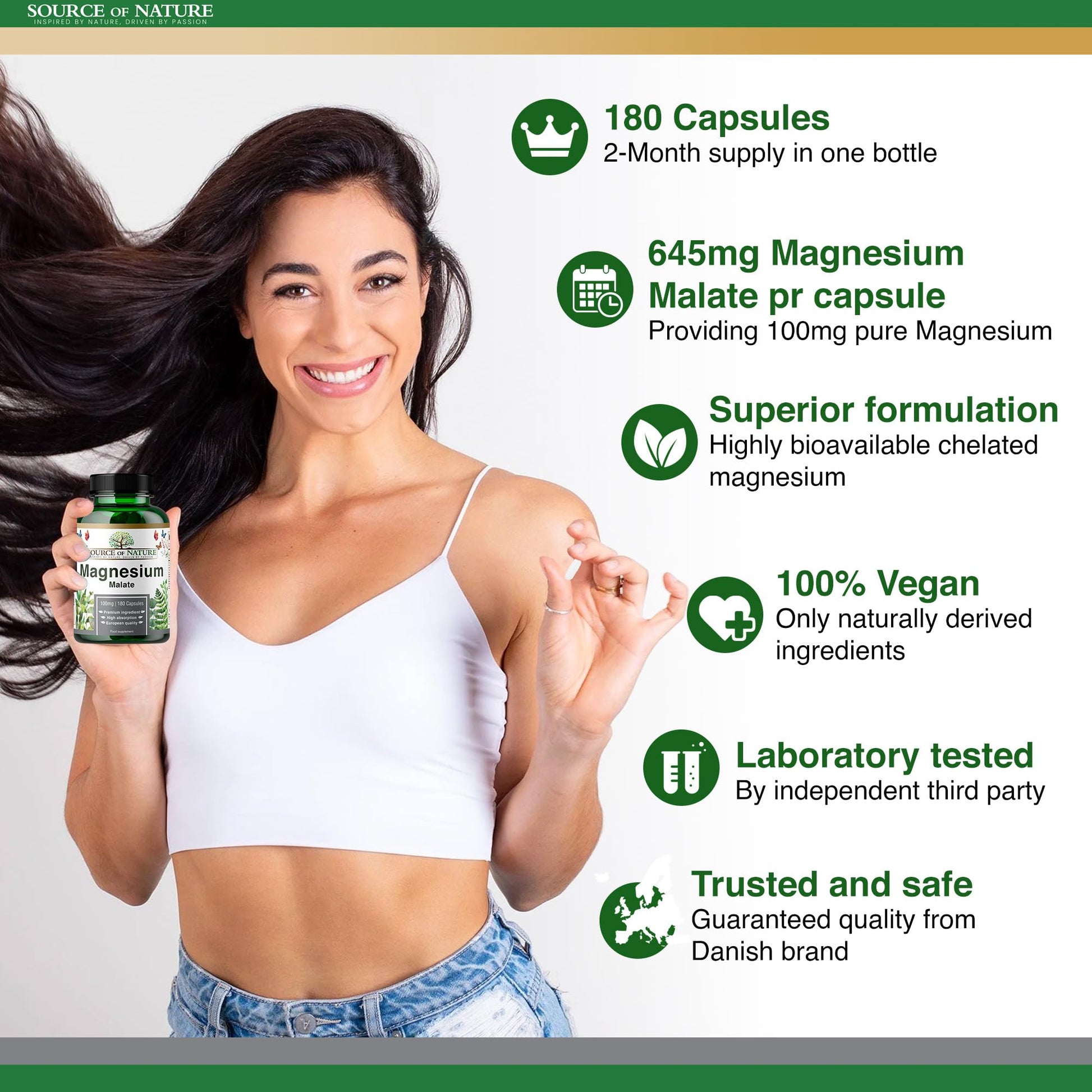 Source of Nature® | Magnesium Malate 645mg | 180 Capsules | 2-Month Supply | 100mg Elemental | High Bioavailability | Easy on The Stomach | Laboratory Tested