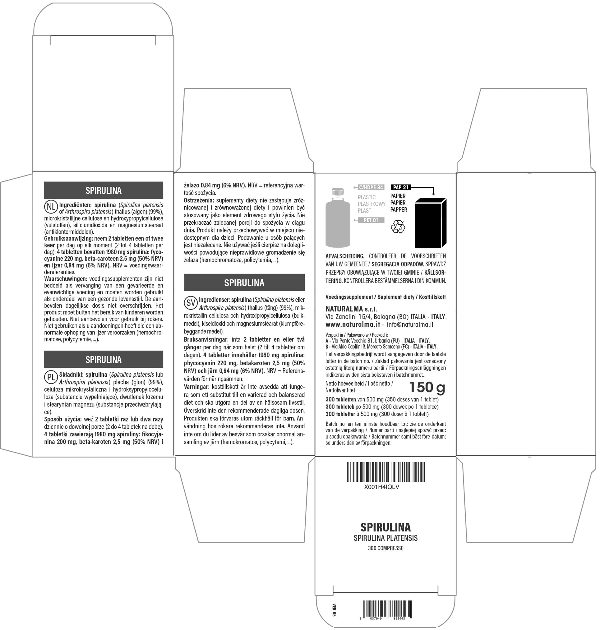 Spirulina (Spirulina platensis or Arthrospira platensis) thallus (seaweed) 300 TABLETS of 500 mg each (150 g format). All NATURALMA food supplements are produced using natural and top quality ingredients. Our company selects the best herbs to ensure a high concentration of functional and nutritional substances. Our products are suitable for vegans and do not contain preservatives, colourants, flavourings and synthetic sweeteners. NATURALMA food supplements are notified to the Italian Ministry of health and are produced and packaged in ITALY. Product in the form of pills and tablets (they are not opercula, capsules or softgels). 1 tablet contain 495 mg of spirulina.More Info