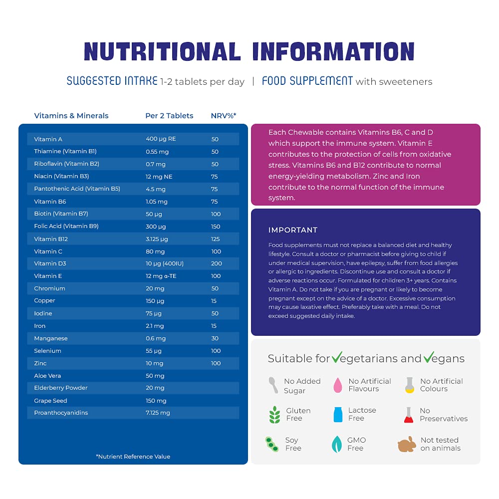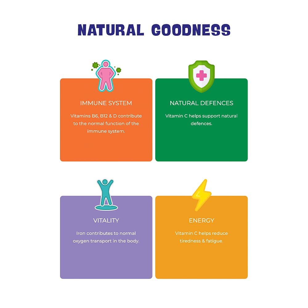 SPONGEBOB SQUAREPANTSImmune Support Orange & Pineapple Chewables have been expertly formulated with 12 essential vitamins and minerals to help support the natural defence system. Each Chewable contains Vitamins B6, B12, C and D which contribute to the normal function of the immune system. With 60 Chewables in each pack, they are also vegan and vegetarian approved and contain no added sugar, artificial colours, flavours or preservatives.More Info