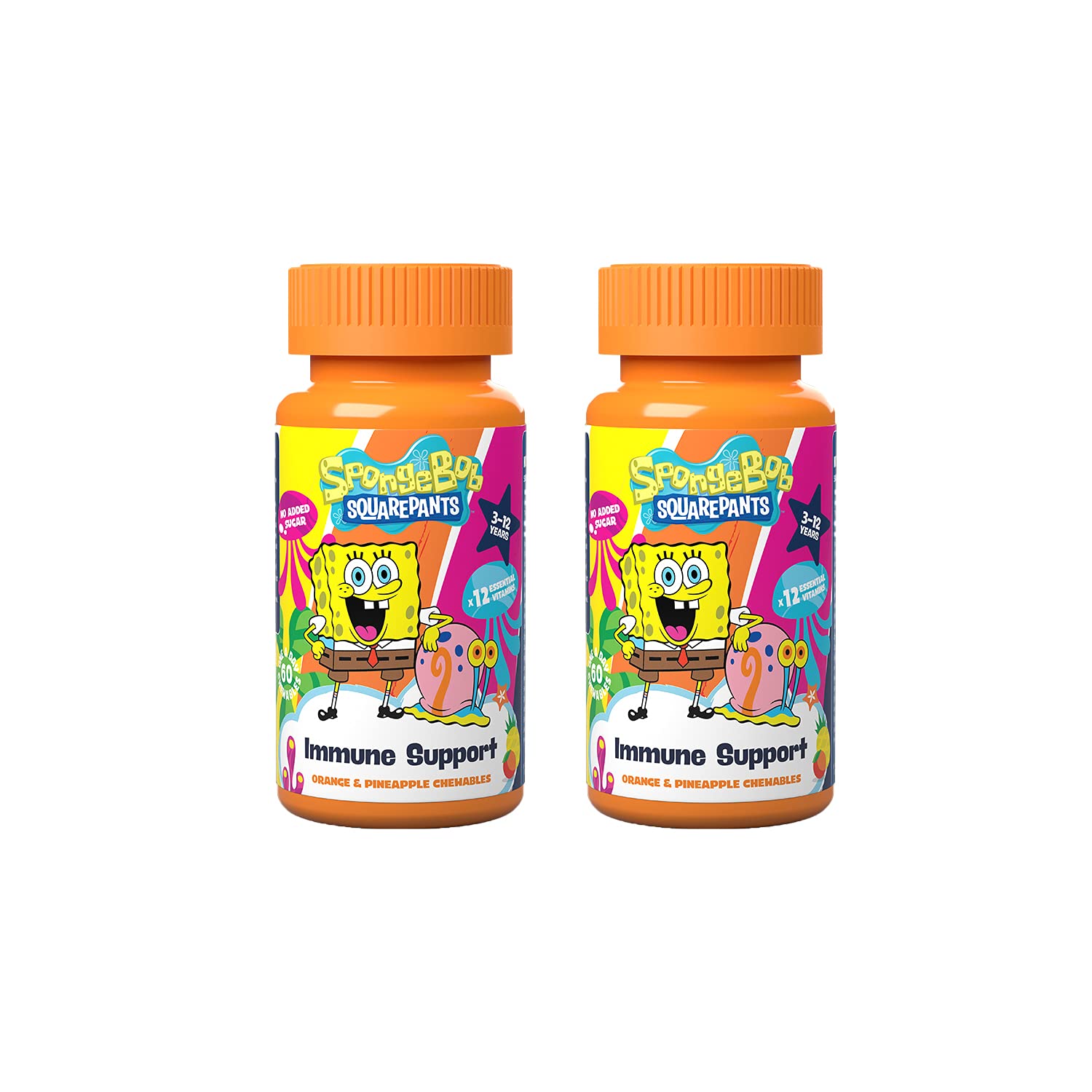 SpongeBob SquarePants Immune Support, 60 Orange & Pineapple Chewables with 12 Essential Vitamins, Vegan, No Added Sugar, for 3-12 Year Olds Duo Pack