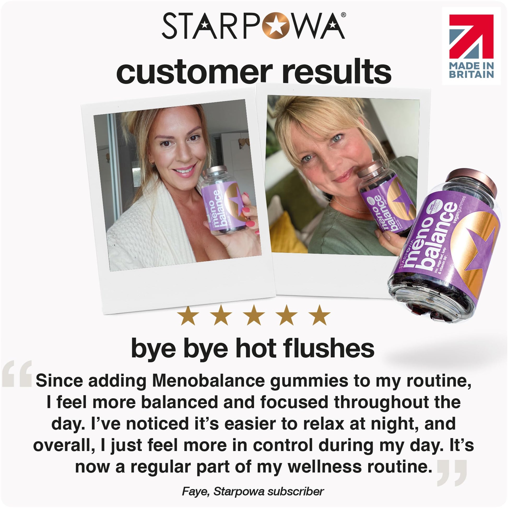 Starpowa Meno Balance - Menopause Multivitamin for Women, Manufactured in the UK Managing menopause symptoms is easier with Meno Balance Gummies, designed to support hormonal balance for women, energy, and sleep. Formulated with sage leaf, organic sea kelp, phytoestrogens, and essential vitamins, these menopause supplements women help with hot flushes, night sweats, and mood swings. Manufactured in the UK, tThe 100% clean formula is plant-based, gluten-free, and keto-friendly, with natural flavours and sweeteners. Each gummy vitamin contains less than 0.1g sugar, offering a pure and effective solution. Just two gummies a day provide the support you need to feel comfortable and balanced. Perfect for those seeking perimenopause supplements and menopause multivitamins for women.More Info