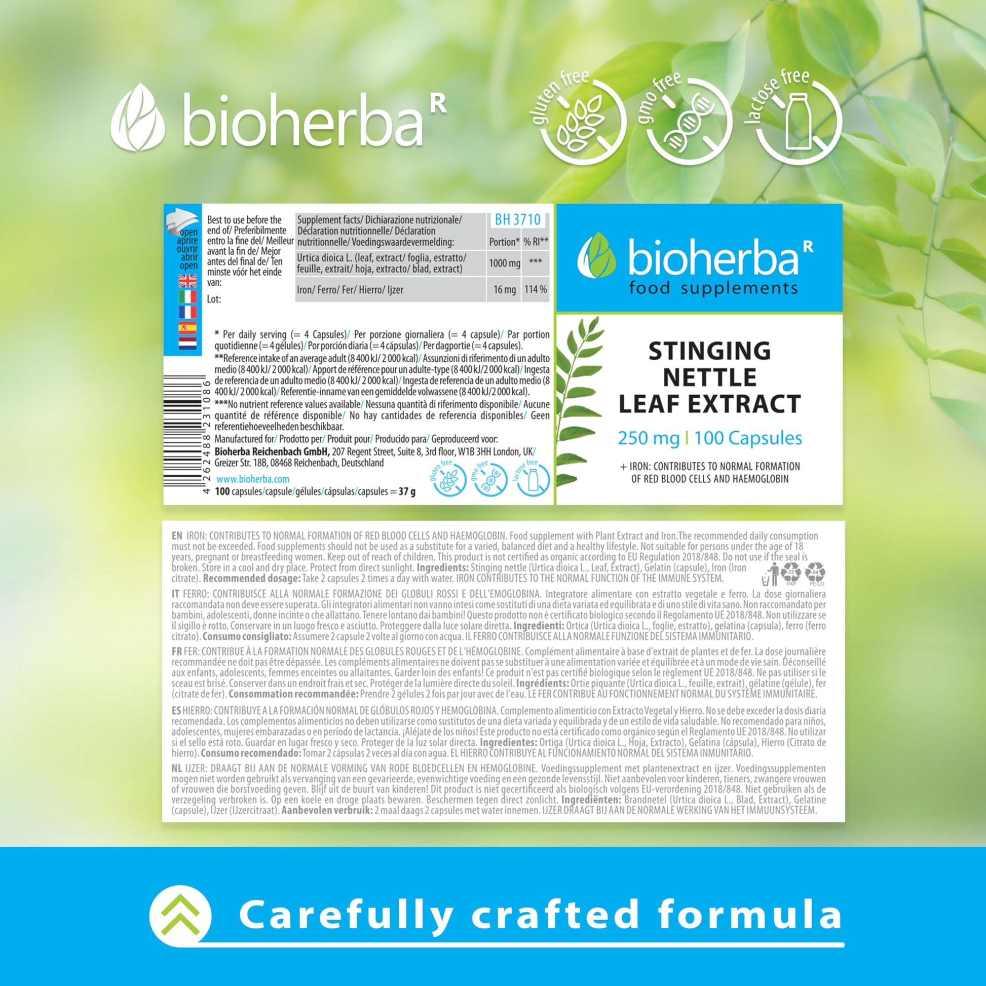 Nettle, also known as Urtica dioica, is a perennial plant native to Europe, Asia, and North AmericaThe addition of iron enhances the benefits of nettle, making these capsules an excellent choice for those looking to improve their overall health and well-being. Benefits: Rich in Nutrients: Nettle is packed with essential vitamins and minerals, including vitamins A, C, K, and B, as well as calcium, magnesium, and iron. This combination supports overall health and vitality. Boosts Iron Levels: The added iron in these capsules helps to combat iron deficiency. This makes it particularly beneficial for individuals with low iron levels or those who require additional iron support. Supports Joint Health: Nettle has natural properties that may help reduce joint stiffness, Promotes Healthy Skin: The antioxidants and nutrients found in nettle can contribute to clearer, healthier skin Enhances Immune Function: Nettle is known for its immune-boosting properties, helping to strengthen the body’s defenses against infections and illnesses. Our nettle capsules with iron are made from high-quality, organic nettle leaves, carefully processed to preserve their nutritional integrity. The added iron ensures that you receive the full spectrum of benefits, making this supplement a powerful addition to your daily health regimen.More Info