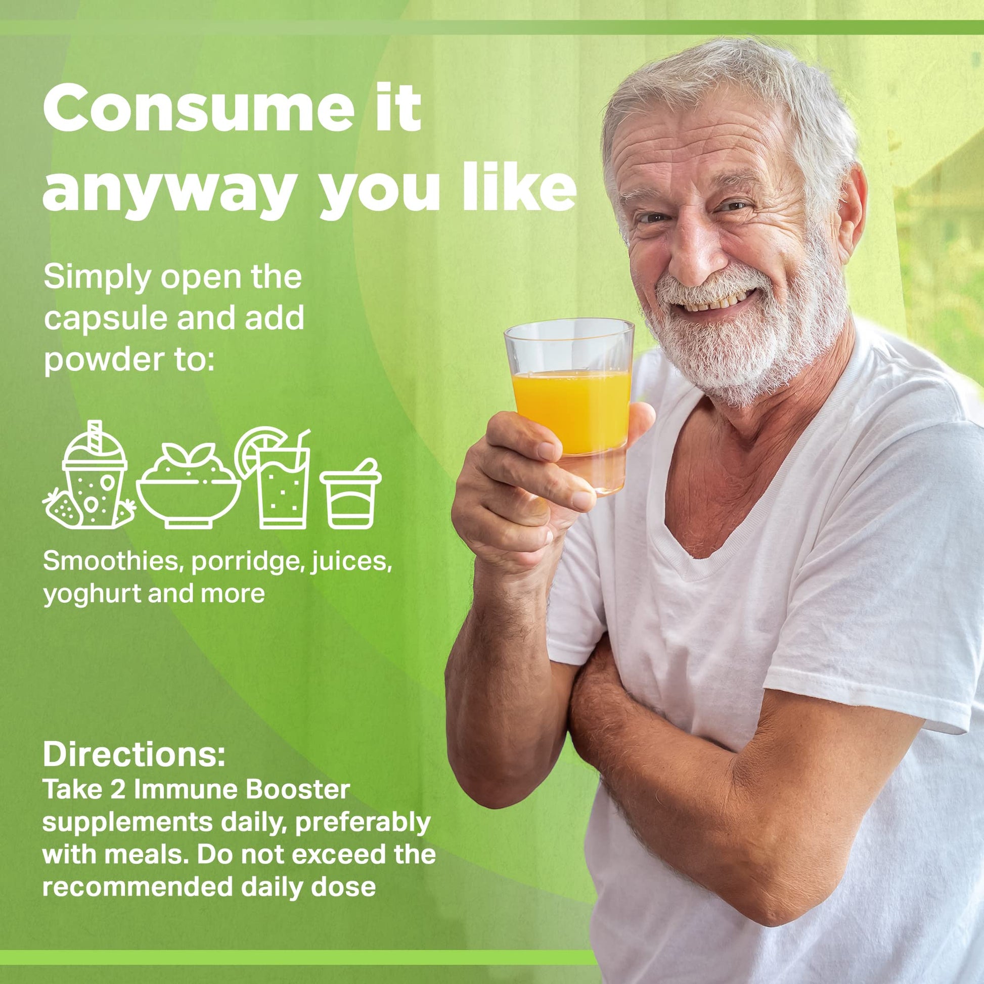 Take 2 vegan supplements daily, preferably with meals. Take 4 capsules daily on the onset of illness or if you are iron deficient. Dosage can increase to 6 capsules daily if needed. Store in a cool, dry place and keep out of children's reach.