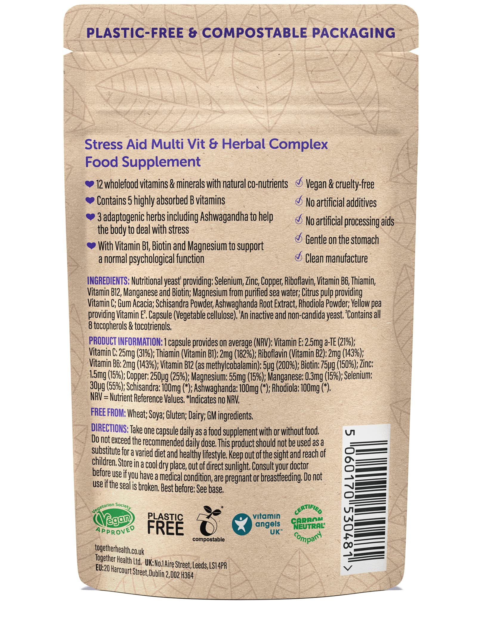 NATURAL STRESS RELIEF: Our award-winning Stress Aid Complex is designed to give your body some TLC when you’re feeling the pressure. Alongside food-based nutrients, we’ve added a carefully selected combination of herbs to provide support for your body during busy or stressful times. 11 FOOD-BASED VITAMINS & MINERALS: Using whole food ingredients we create vitamins that are easily absorbed and gentle on the stomach. Stress Aid contains 11 food-based vitamins and minerals, including 5 essential B vitamins, plus ocean-sourced magnesium to support your body and mind. 3 ADAPTOGENIC HERBS: Our formulation also includes three adaptogenic herbs – Schisandra, Ashwagandha and Rhodiola – that support your adrenal system and help your body to manage the way it responds to stress. PURE. CLEAN. VEGAN: At Together, we take pride in creating products you will always be able to trust. Our entire range is certified vegan and free from artificial additives, preservatives and processing aids, ensuring you are getting the purest product available. SAFE & ALLERGEN-FREE: Our Stress Aid Complex is made with sustainably harvested plant-based and ocean-sourced ingredients. It is independently tested safe for pesticides, heavy metals, dioxins and PCBs, and free from wheat, yeast, gluten, soya, lactose, added sugars, additives, colourings, flavourings, preservatives and GMOs.More Info