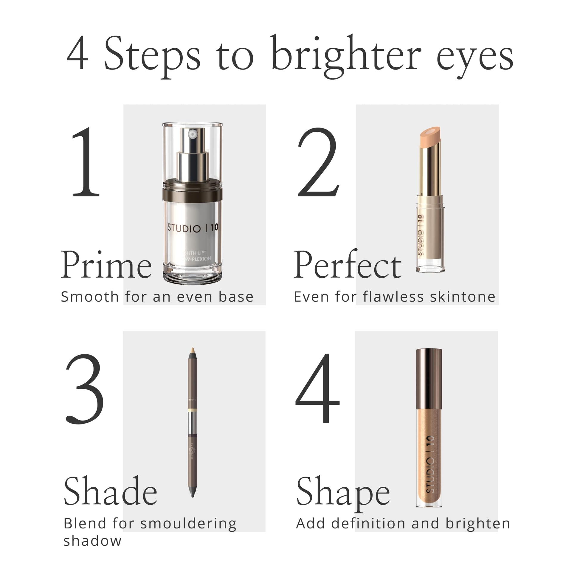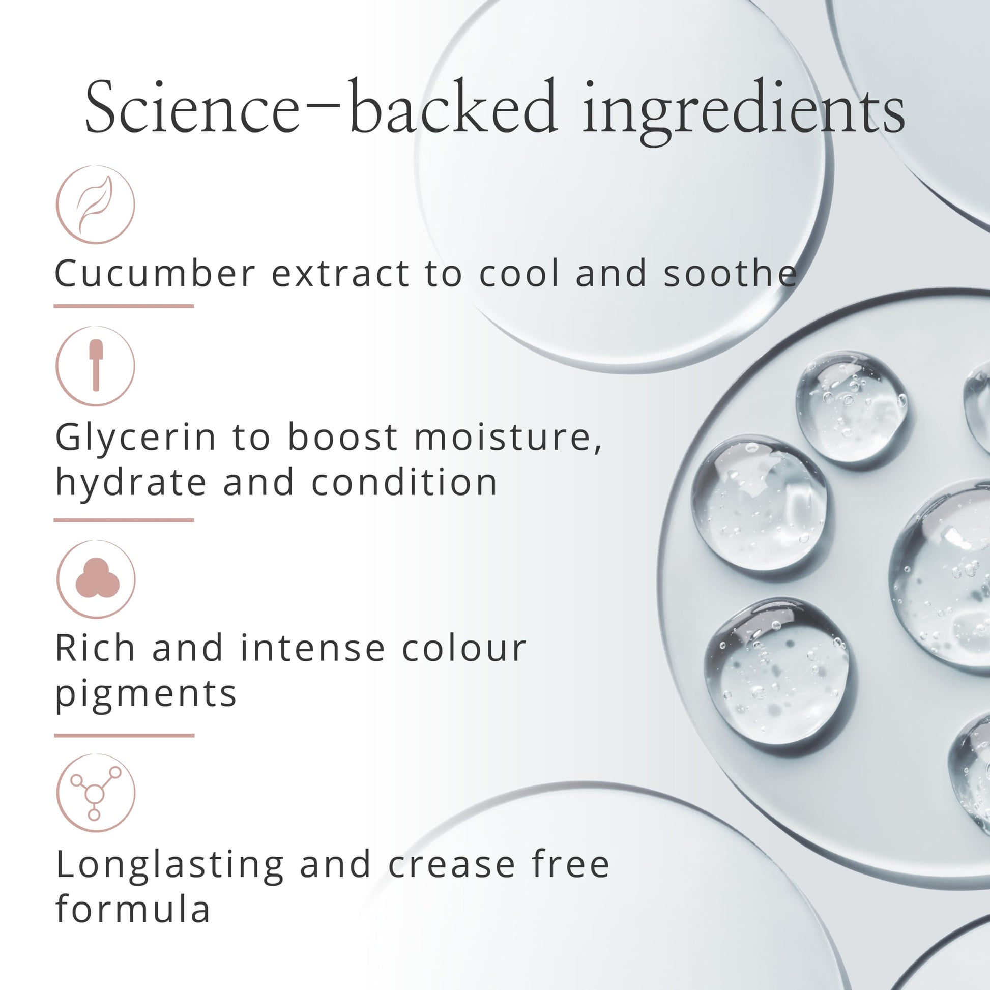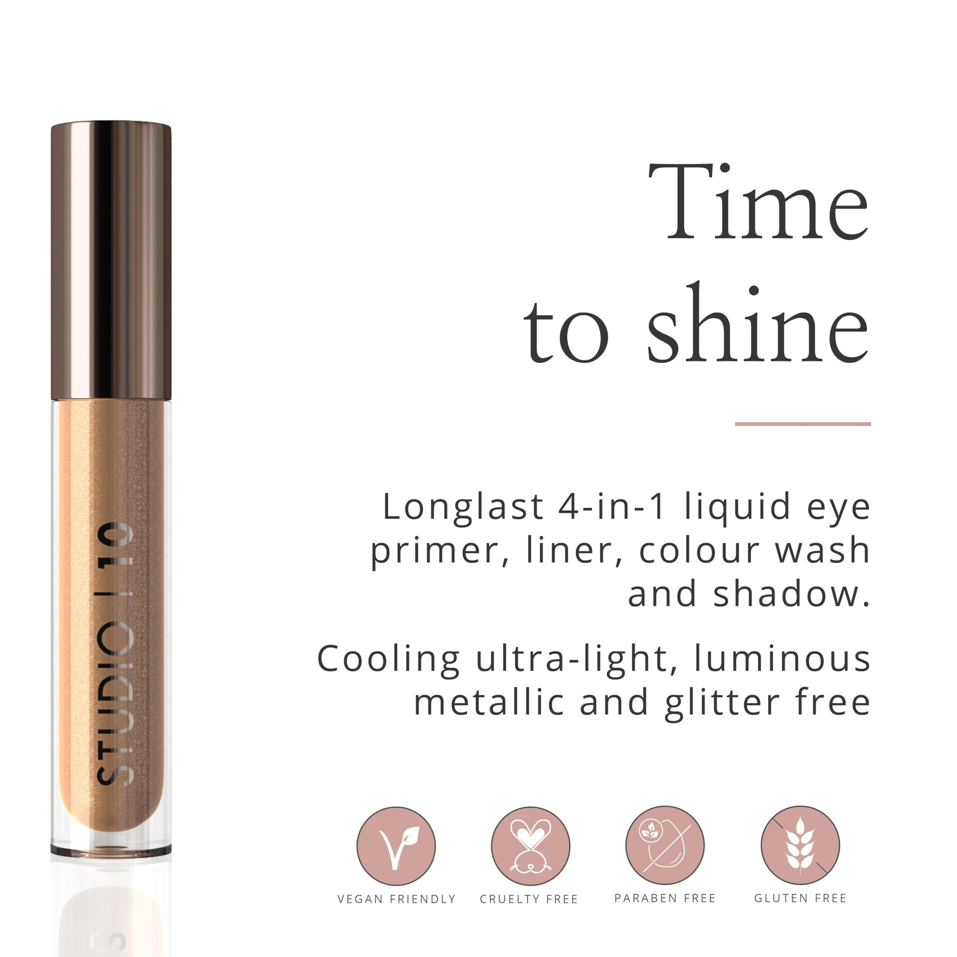Transform your eyes into dazzling showstoppers with Studio 10 Liquid Foil I-Radiance Eyeshadow – a must-have in your makeup arsenal! Get ready to shine! Our Liquid Foil I-Radiance Eyeshadow adds a luminous, shimmering glow to brighten your eyes, making them impossible to ignore. It's not just an eyeshadow; it's a 4-in-1 makeup wonder. Use it as a primer to intensify your eyeshadow, a liner to define your eyes, a colour wash for a bold look, or a shadow to create depth. Your eye makeup just got simpler and more versatile. Tired of dealing with eyeshadows that crease and smudge? Say goodbye to the hassle. Our eyeshadow is crease-free and budge-proof, giving you a smoother, long-lasting look that stays fresh all day. Experience the cool, soothing touch of Cucumber extract. It's more than makeup; it's a pampering session for your eyes, leaving you refreshed and relaxed. Hydrate and condition your eyes with moisture-boosting glycerin. Our eyeshadow isn't just about beauty; it also cares for your delicate eye area, unlocking your eye makeup's full potential.More Info