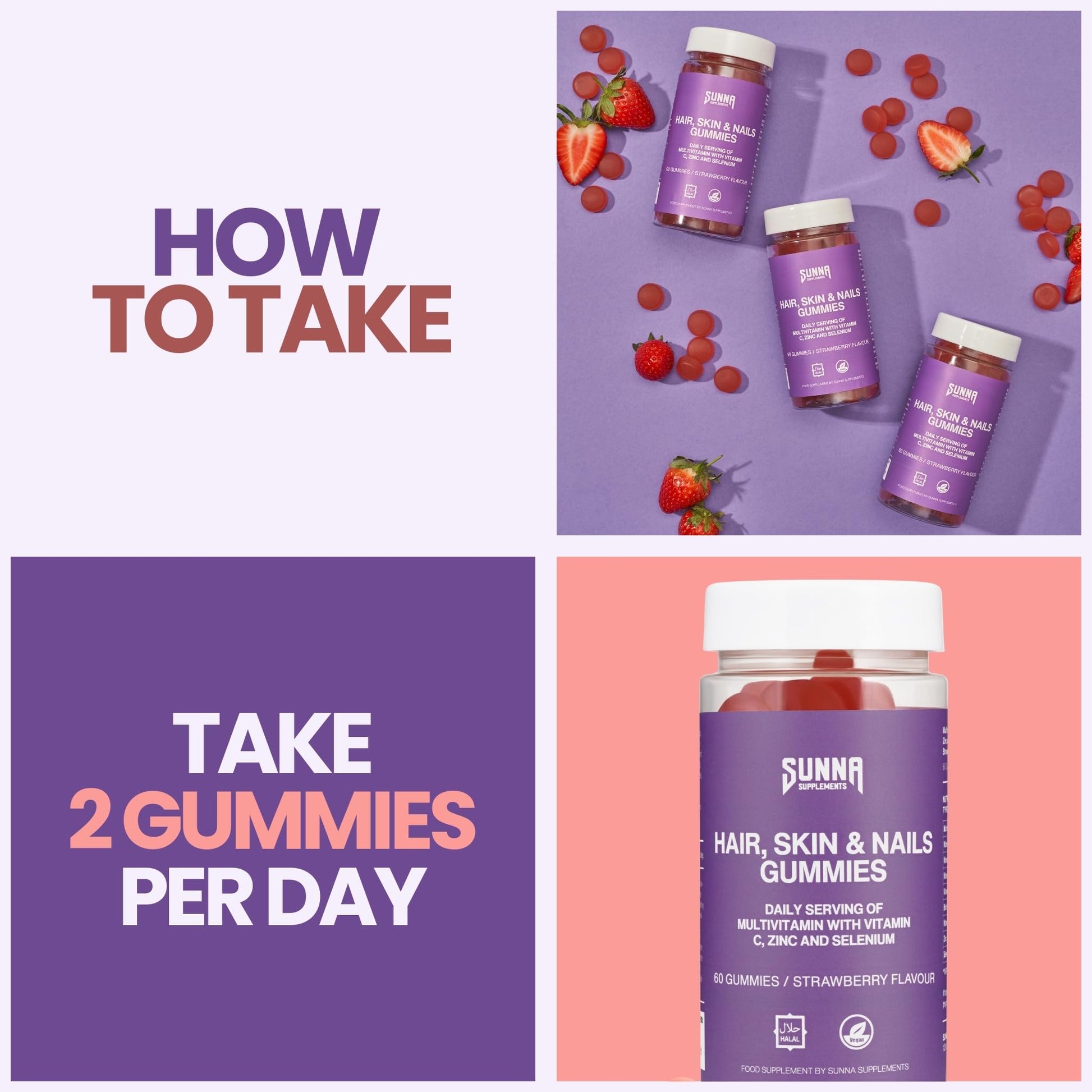 Achieve thicker hair, stronger nails, and radiant skin with our Halal Hair, Skin & Nails Gummies. Designed for both women and men, these biotin gummies are enriched with zinc, selenium, and essential vitamins A, C, D, and E to support hair growth, nail strength, and glowing skin. Whether you're dealing with hair thinning, brittle nails, or dull skin, these hair supplements for women and men help nourish your beauty from within. Our hair growth vitamins provide daily essential nutrients that promote healthy hair follicles, collagen production, and skin elasticity. Biotin, also known as vitamin B7, plays a crucial role in strengthening hair strands and preventing breakage, while zinc and selenium support scalp health and combat hair loss. The inclusion of vitamin C and E helps protect against oxidative stress, keeping skin hydrated and youthful. Unlike traditional hair skin and nails vitamins in pill form, these delicious, chewable gummies make it easier than ever to get your daily dose of hair growth support. The great-tasting formula eliminates the hassle of swallowing large tablets, making it a fun and convenient way to nourish your hair, nails, and skin. Formulated with natural ingredients, these vegan and gelatin-free hair vitamins are suitable for those following a halal, vegetarian, or plant-based lifestyle. Free from artificial colors, flavors, and preservatives, they are designed to provide pure, high-quality nutrition without unnecessary additives. Regular use of these hair growth gummies for women and men helps promote thicker, longer, and shinier hair, while also enhancing nail strength and improving skin texture. Whether you're experiencing hair thinning due to stress, aging, or nutritional deficiencies, these hair supplements for women and men offer comprehensive beauty support. In addition to boosting hair growth, these hair vitamins also contribute to overall wellness, supporting immune function, metabolism, and energy levels. With a powerful blend of essential nutrients, these gummies work to strengthen weak nails, reduce breakage, and promote natural beauty from within. Incorporate these hair, skin, and nails vitamins into your daily routine and experience the benefits of a complete hair care supplement. Enjoy the convenience of easy-to-take biotin gummies.More Info
