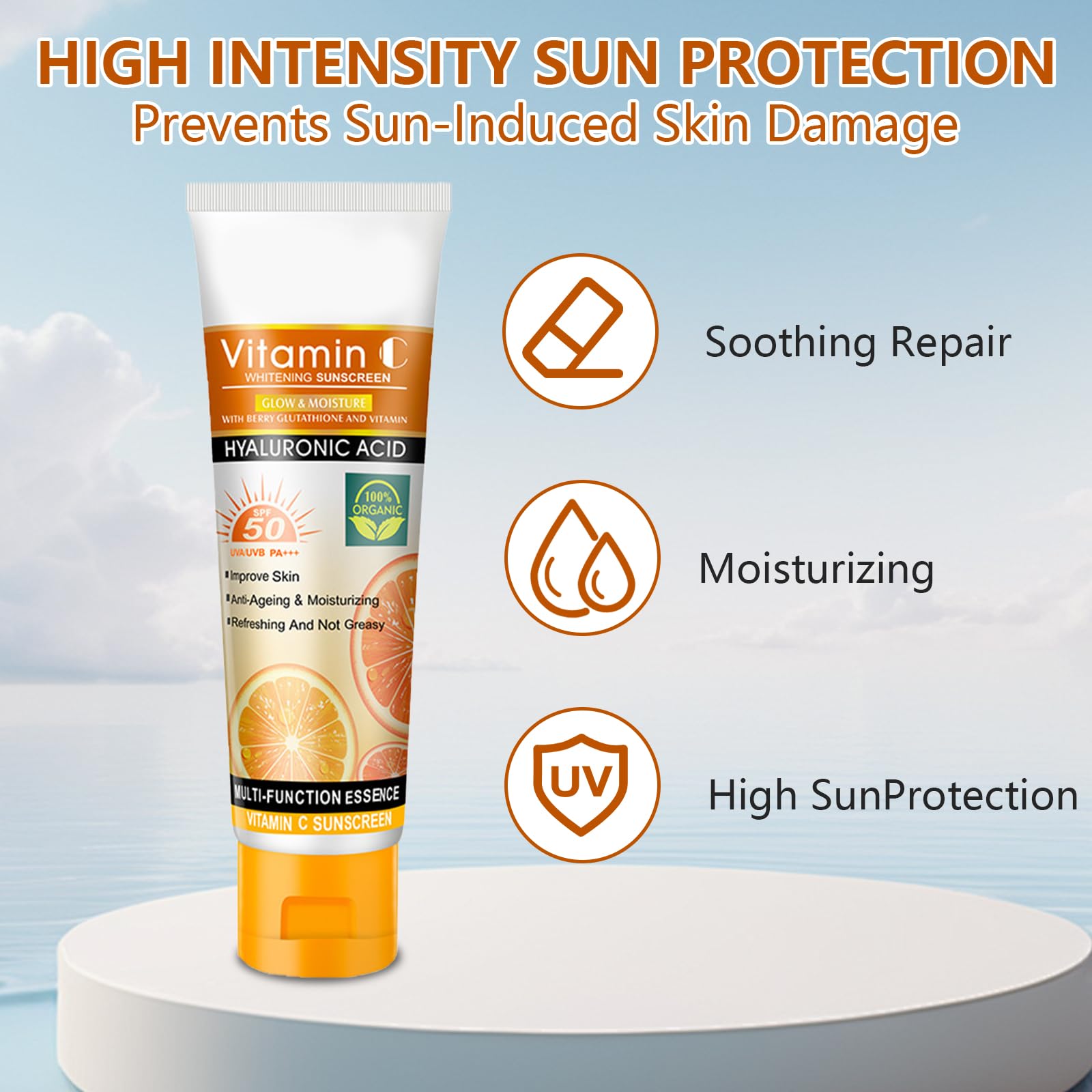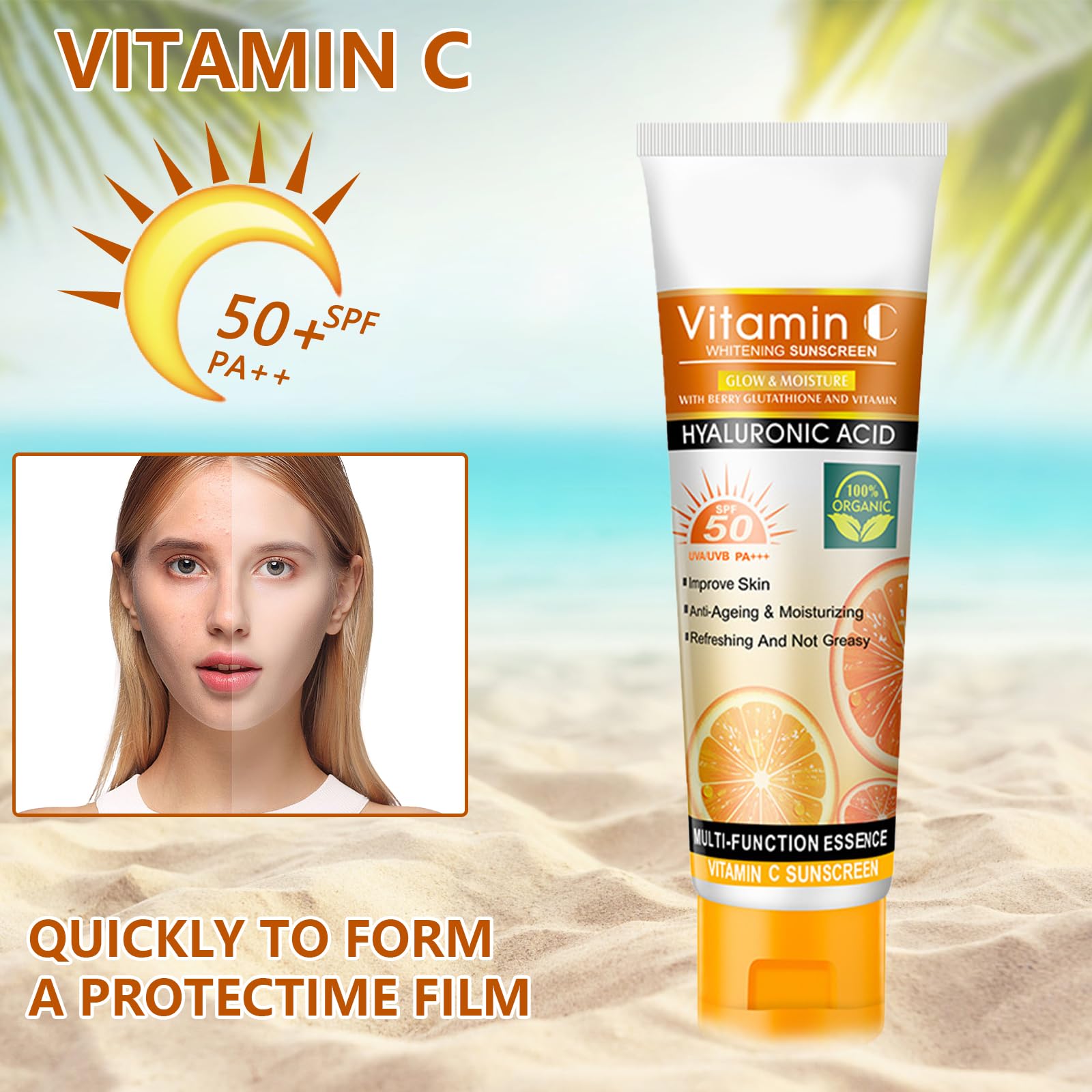 Introducing sun cream spf 50 with Vitamin C, which provides comprehensive protection against harmful UVA/UVB rays while nourishing the skin. If you're looking for a spf face moisturiser that protects against sun damage and premature aging, our advanced formula has you covered.