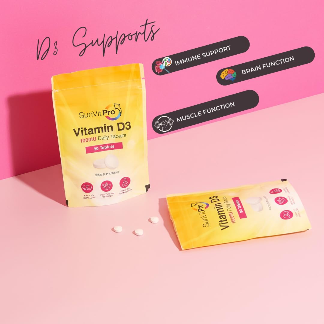 SunVit-D3 Vitamin D 1000IU - Cholecalciferol Vitamin D Tablets 1000IU Support the Maintenance of Bone, Teeth, Muscle & Immune System | UK Made, GMP Approved, Dairy & Gluten free D3 Vitamins 90 Tablets
